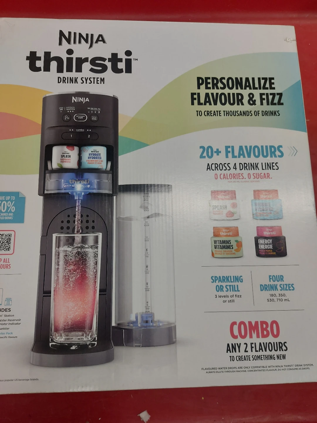 I'm selling a brand-new Ninja Thirsti Drink System! Personalize flavour and fizz to create thousands of drinks. It has 20+ flavours across 4 drink lines, with 0 calories and 0 sugar. You can choose sparkling or still with 3 levels of fizz or still, and four drink sizes: 180, 350, 530, 710 mL. It includes a fizz infuser, CO2 tank adaptor, water reservoir, flavour canister, and CO2 canister dock