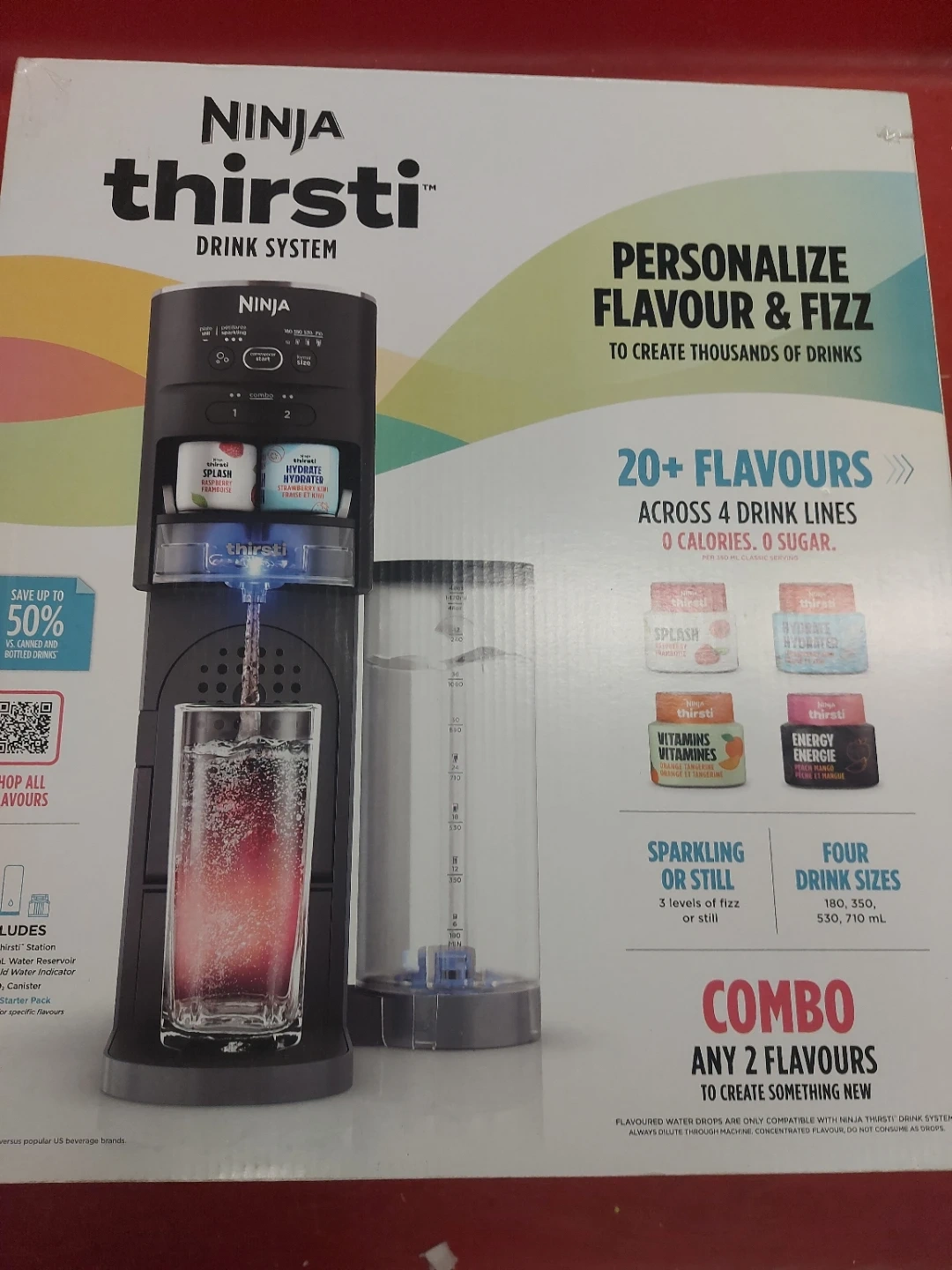 I'm selling a brand-new Ninja Thirsti Drink System! Personalize flavour and fizz to create thousands of drinks. It has 20+ flavours across 4 drink lines, with 0 calories and 0 sugar. You can choose sparkling or still with 3 levels of fizz or still, and four drink sizes: 180, 350, 530, 710 mL. It includes a fizz infuser, CO2 tank adaptor, water reservoir, flavour canister, and CO2 canister dock