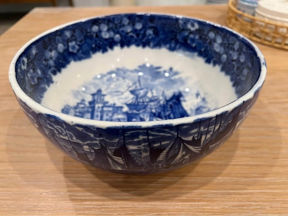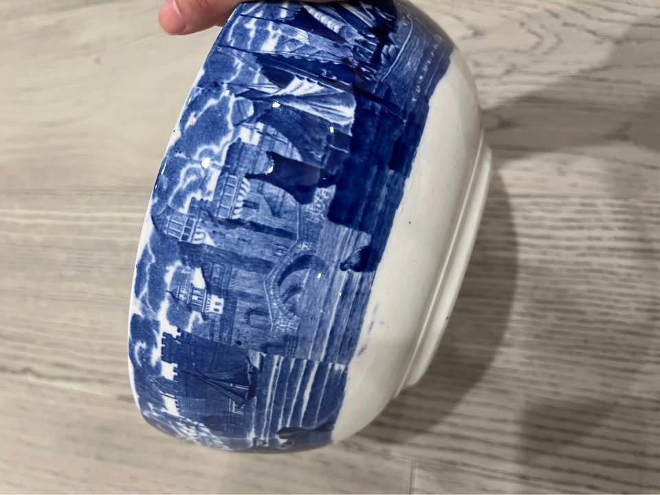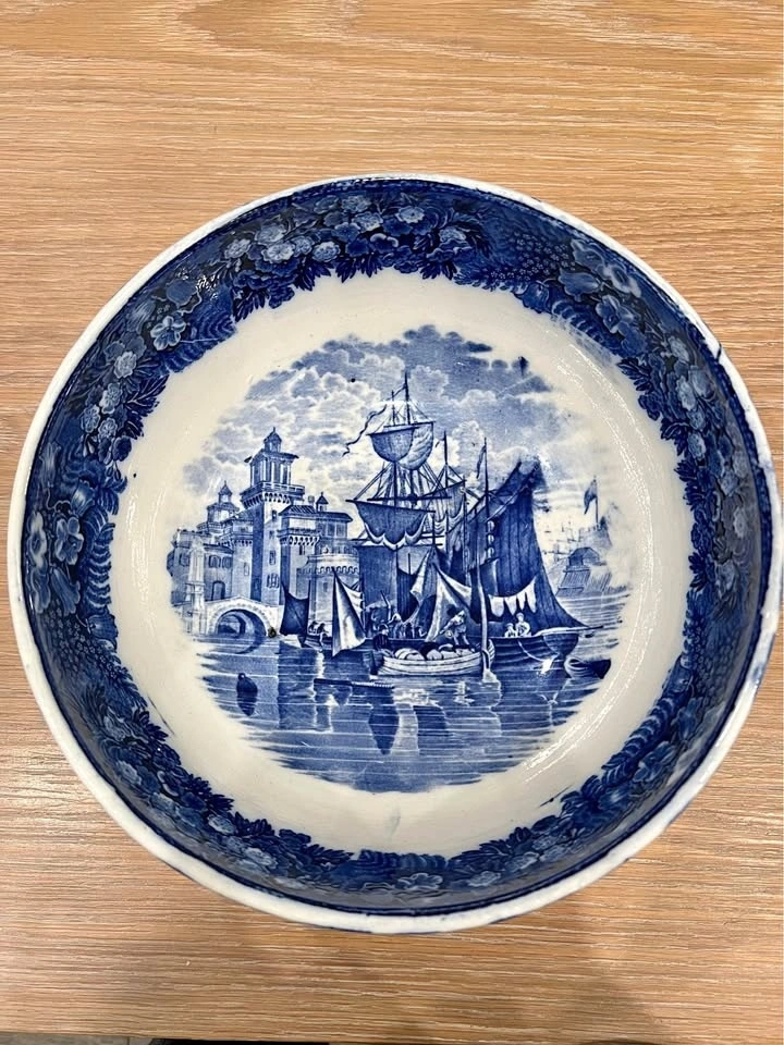 Large antique blue and white transferware bowl produced by Davenport in Staffordshire, England, dating to the early 19th century (circa 1820–1835).