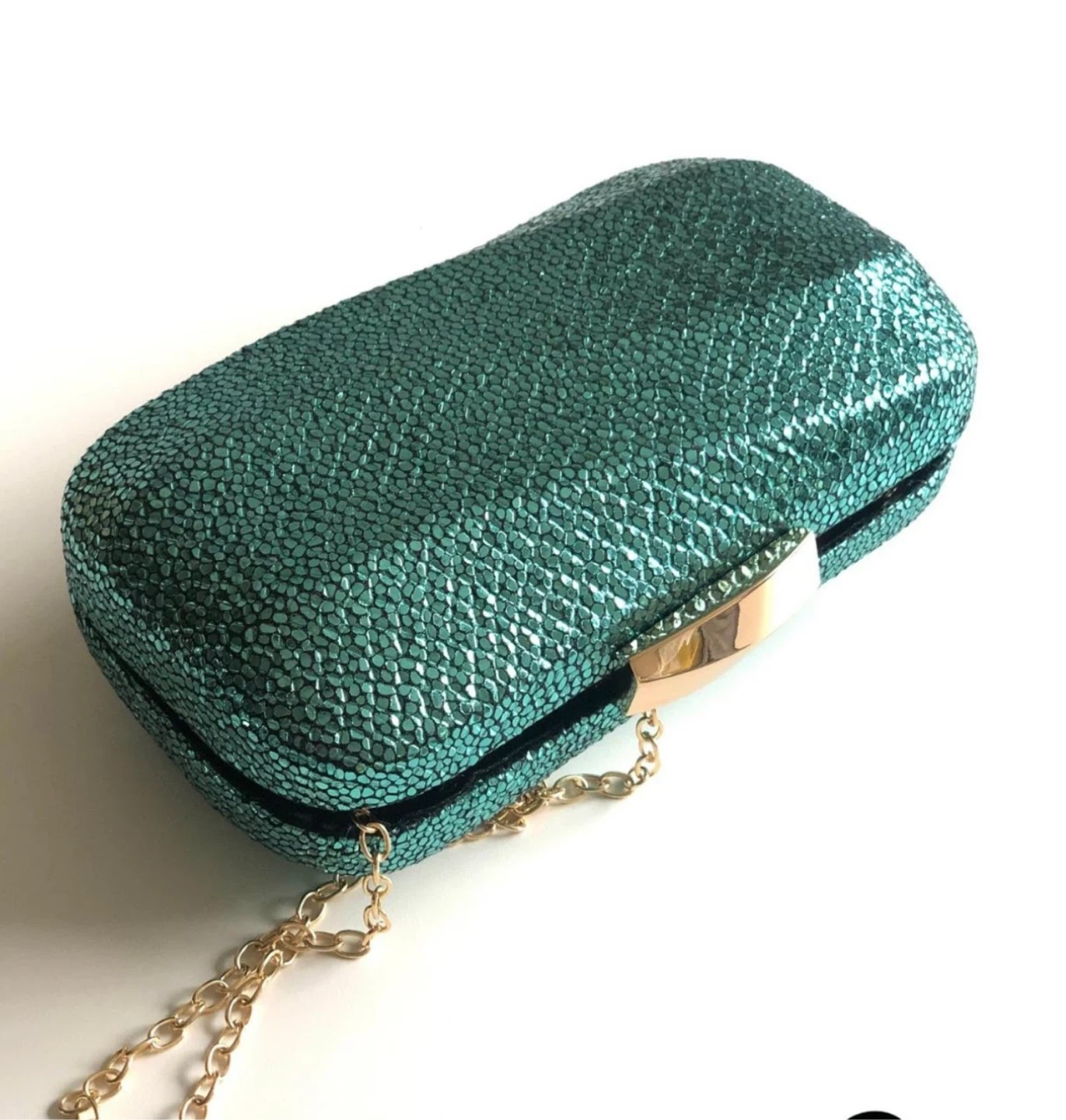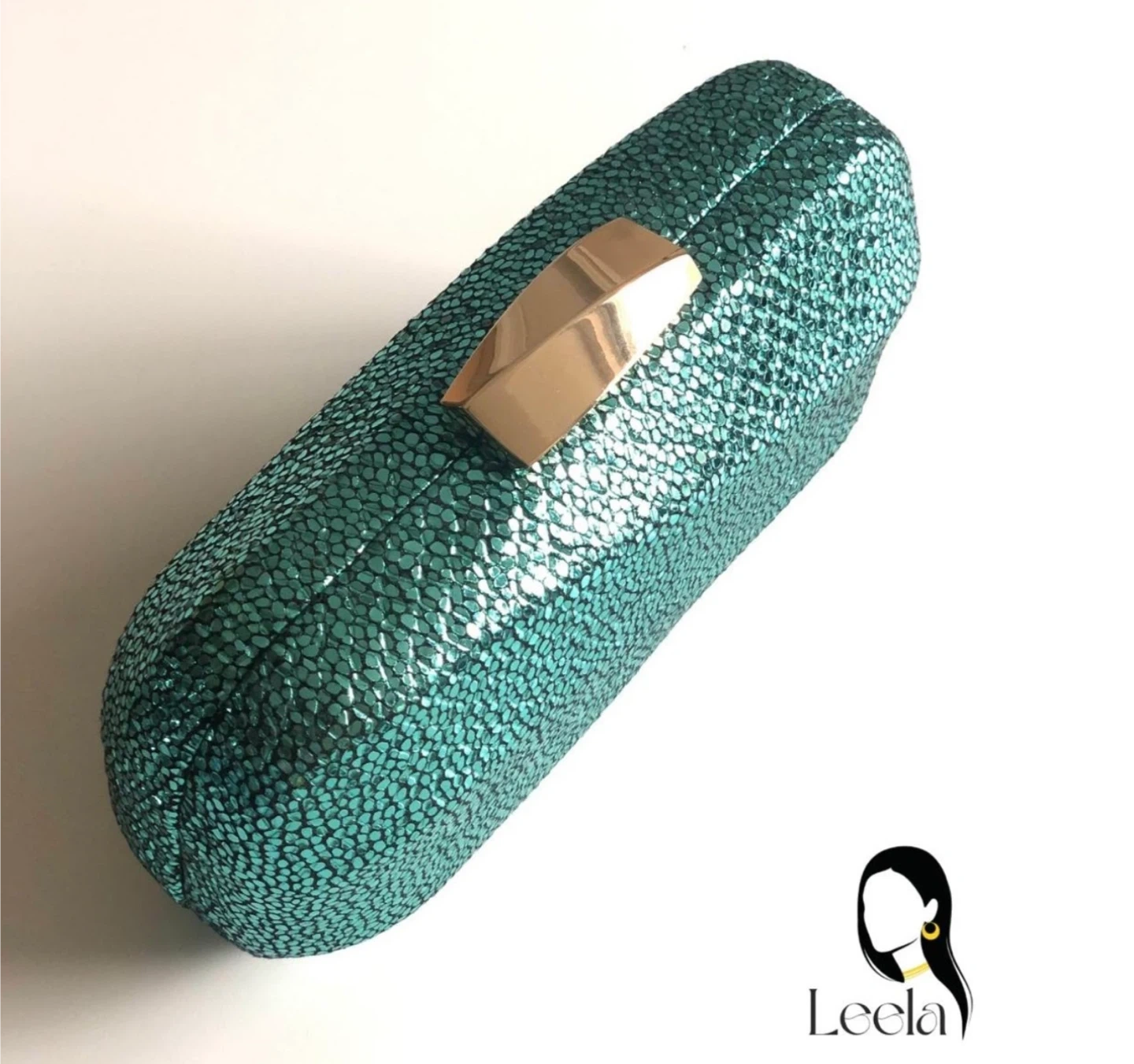 Selling a lovely teal clutch from Leela! It features a unique textured design and elegant gold accents. Perfect for a night out or a special occasion.