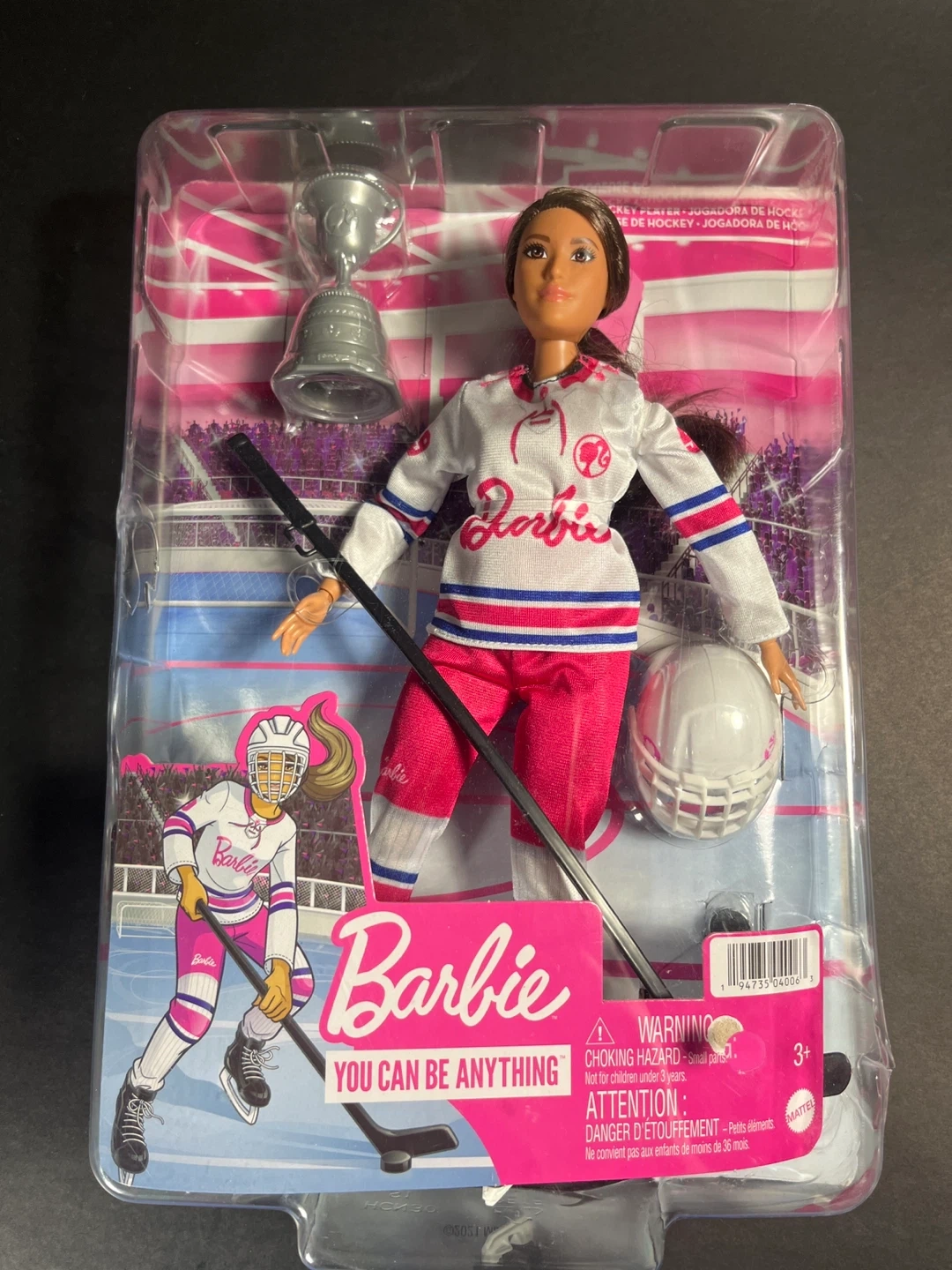 Selling a brand new Barbie Hockey Player doll! It comes in the original box and includes the doll, hockey stick, helmet, and trophy. Perfect for Barbie collectors or hockey fans