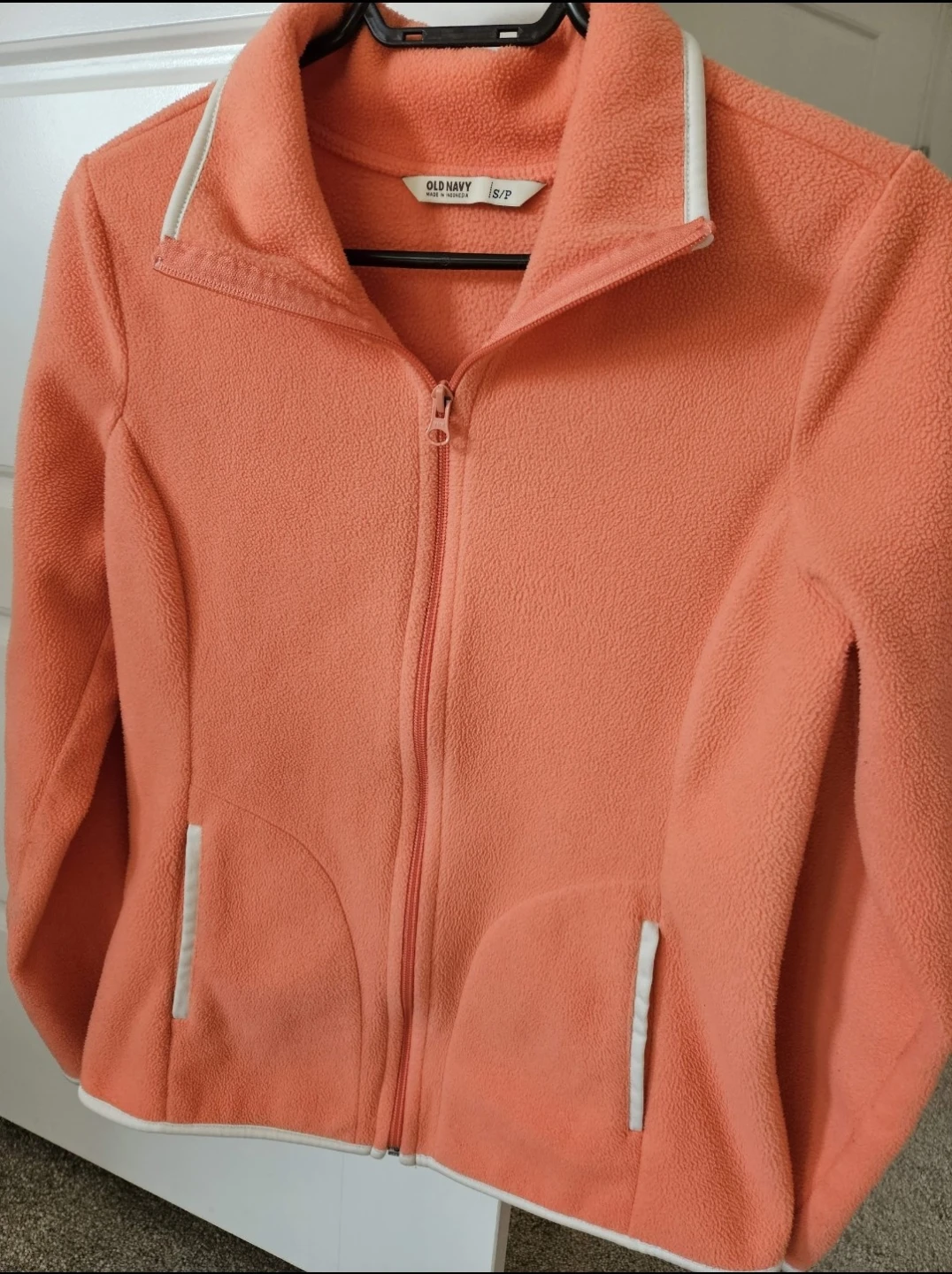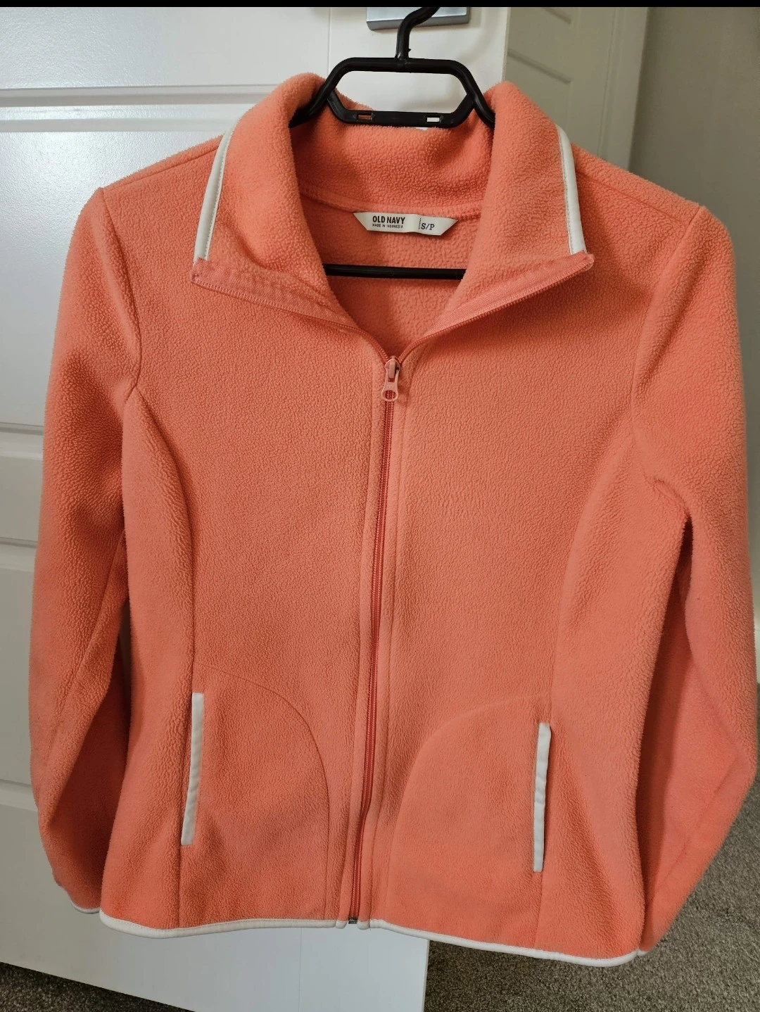 Cozy Old Navy fleece jacket in a lovely coral colour! It's a size small and has a full zip. It looks like new. Perfect for layering or wearing on its own during cooler days.