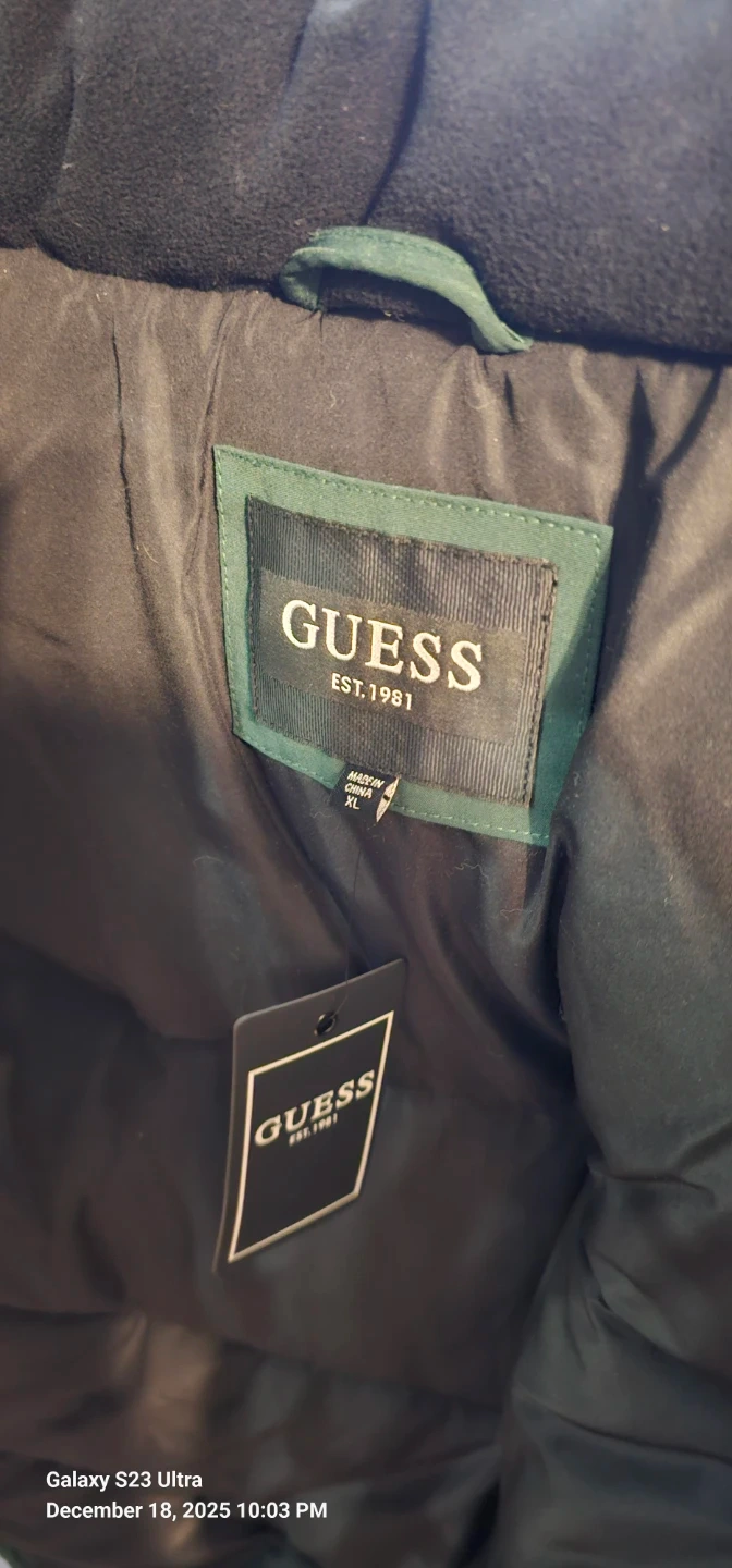 I have a Guess puffer jacket for sale! It's a size XL and features a stylish colour block design with black and green. The jacket is in great condition and ready for the colder weather
