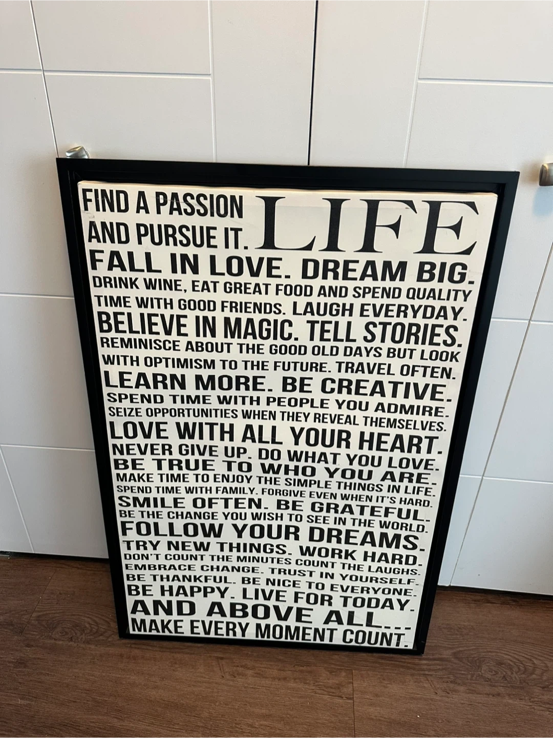 This is a framed print featuring an inspirational quote about life. It includes phrases like 'Fall in love', 'Dream big', and 'Believe in magic'. This would be a great addition to any room!