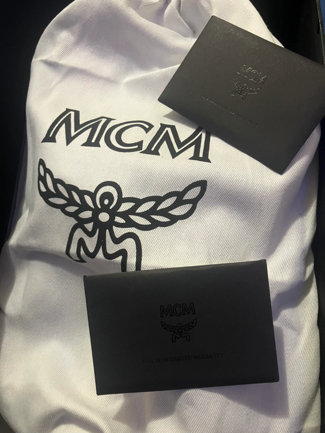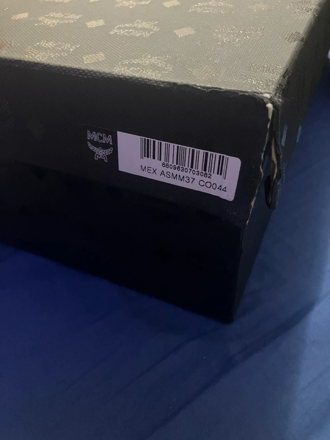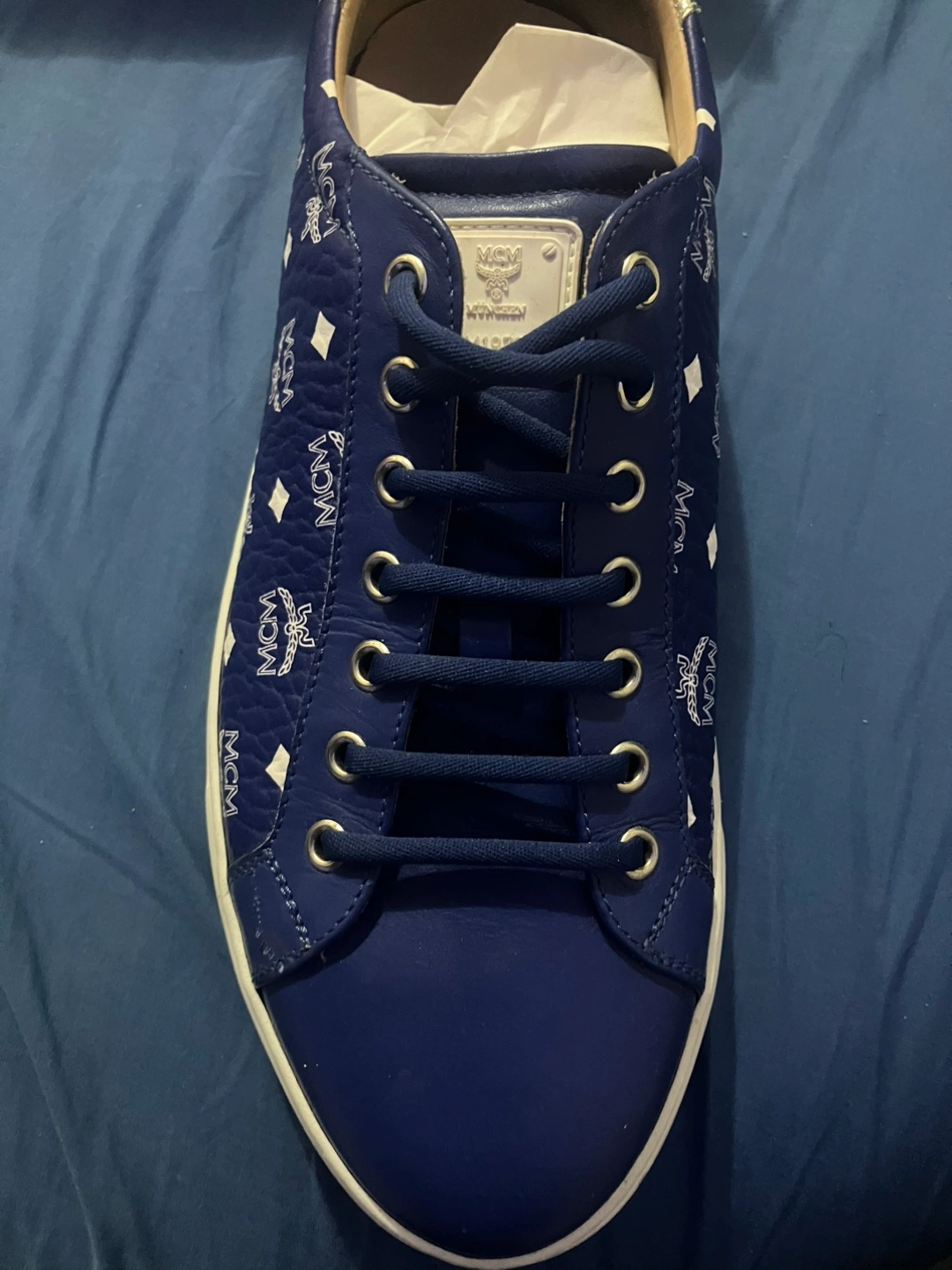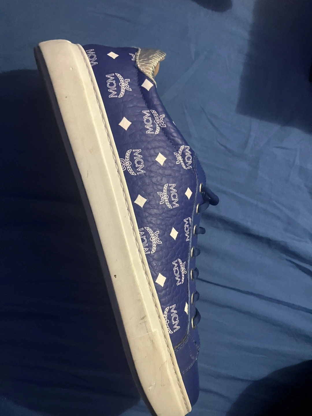 Selling a pair of MCM sneakers in blue leather. These have the classic MCM logo pattern. They're in good condition