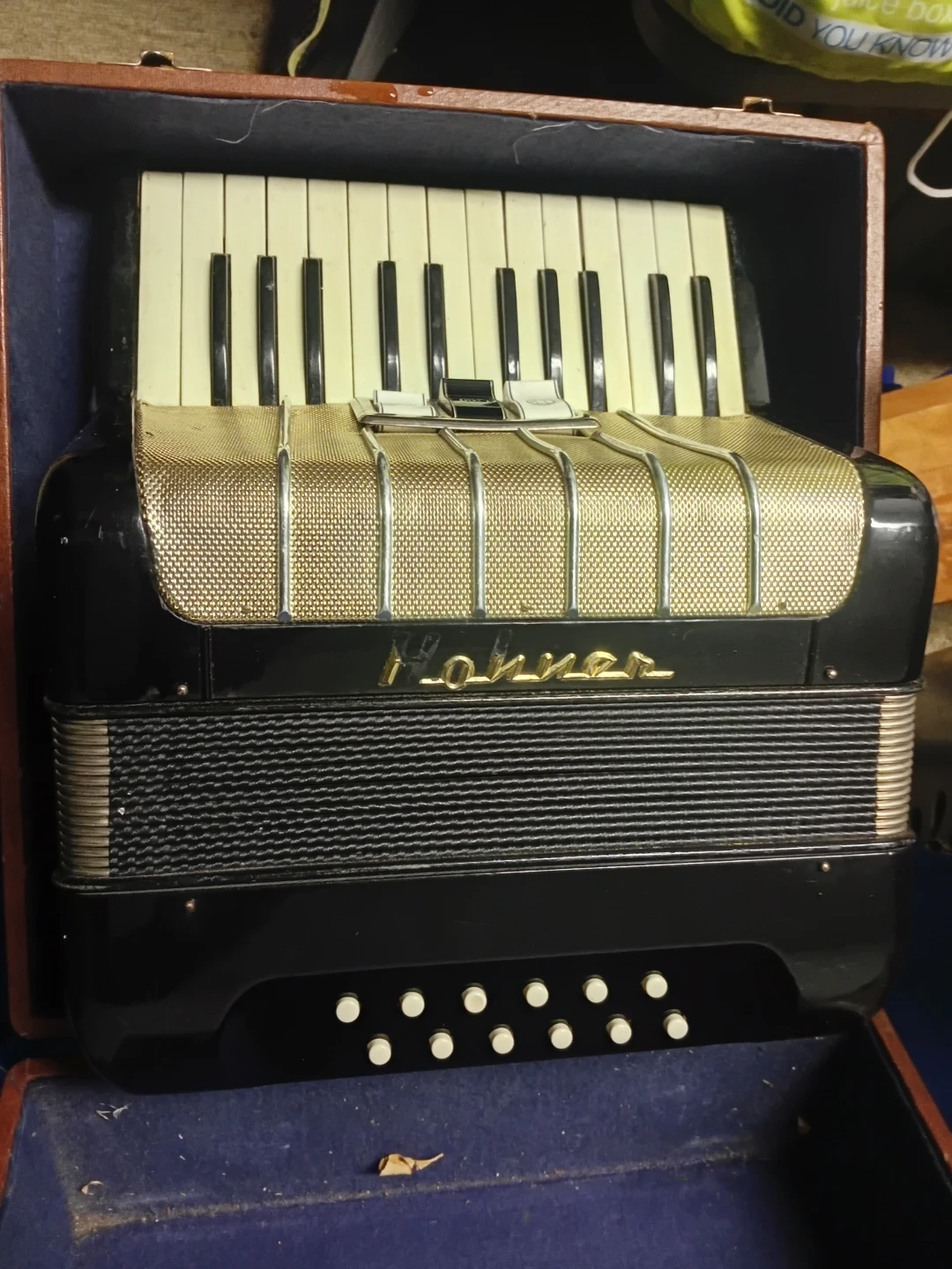 Selling a Hohner accordion that comes with its case. It has a classic look with its black and gold design. Perfect for someone who wants to learn or already plays the accordion!
