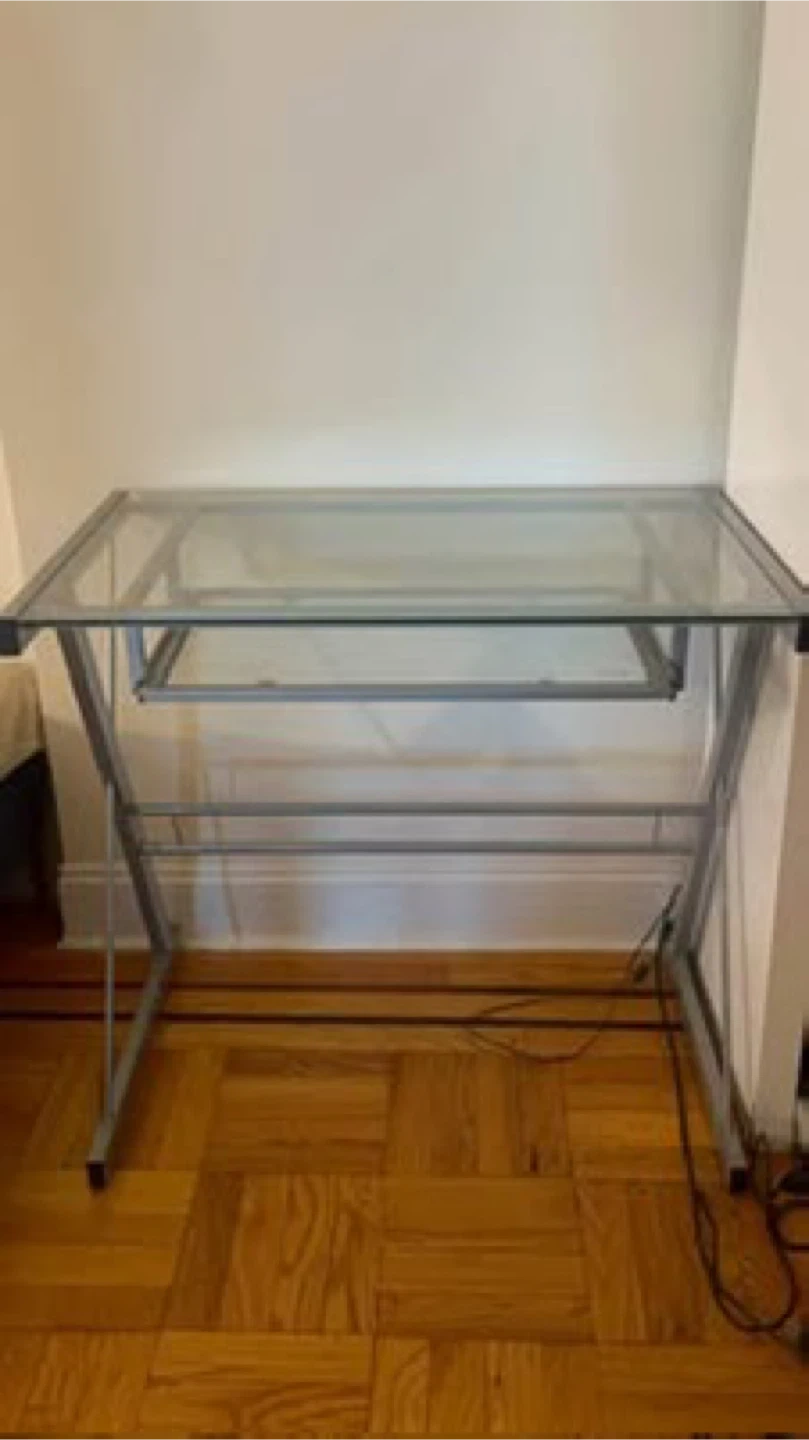 Selling a glass top desk with a metal frame. It's in good condition and perfect for a home office or study space. Features pulls-out keyboard tray. The sleek design will fit well with any decor!