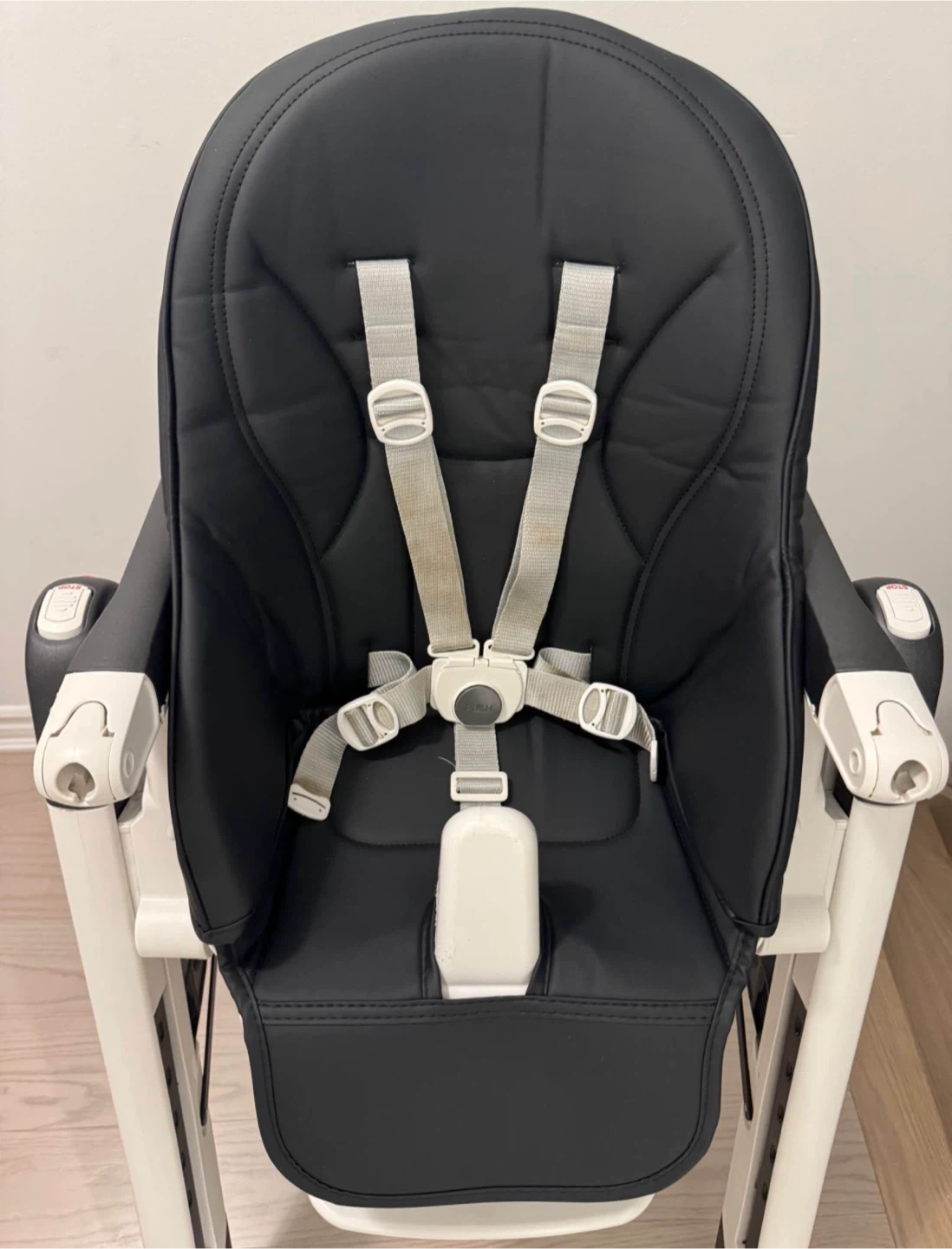 Selling a Peg Perego high chair, made in Italy! It features a black seat and a white frame. It has some wear on the straps, but is otherwise in good condition. Perfect for your little one's mealtime!