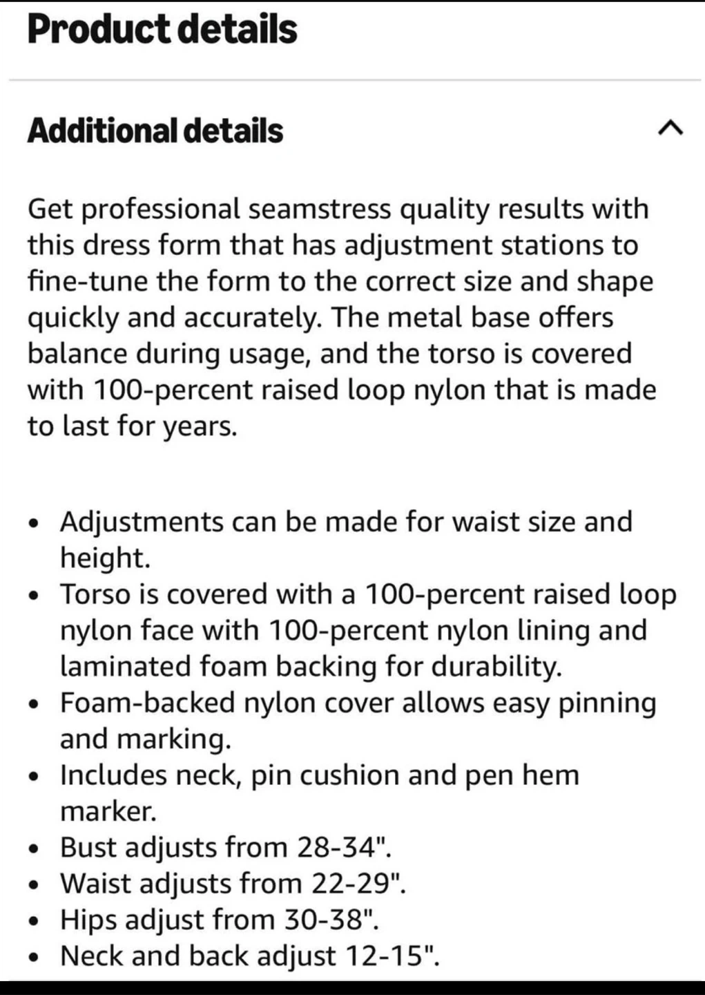 The torso is covered with 100-percent raised loop nylon that is made to last for years. Adjustments can be made for waist size and height. It also includes a neck, pin cushion and pen hem marker.