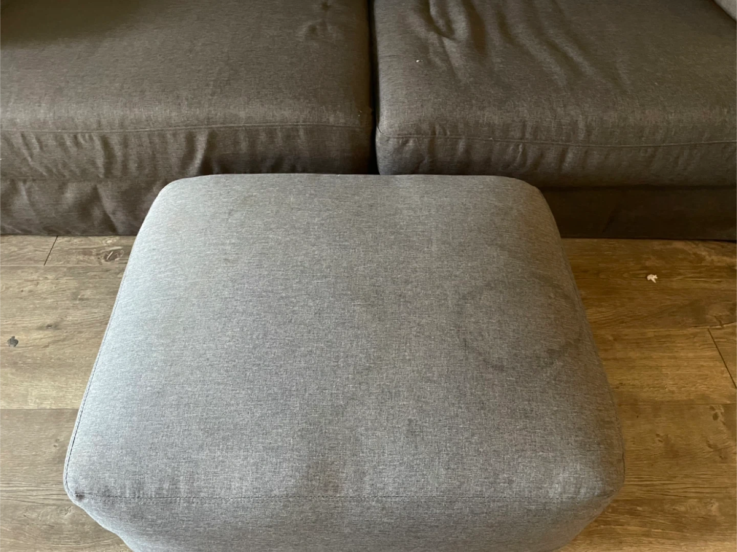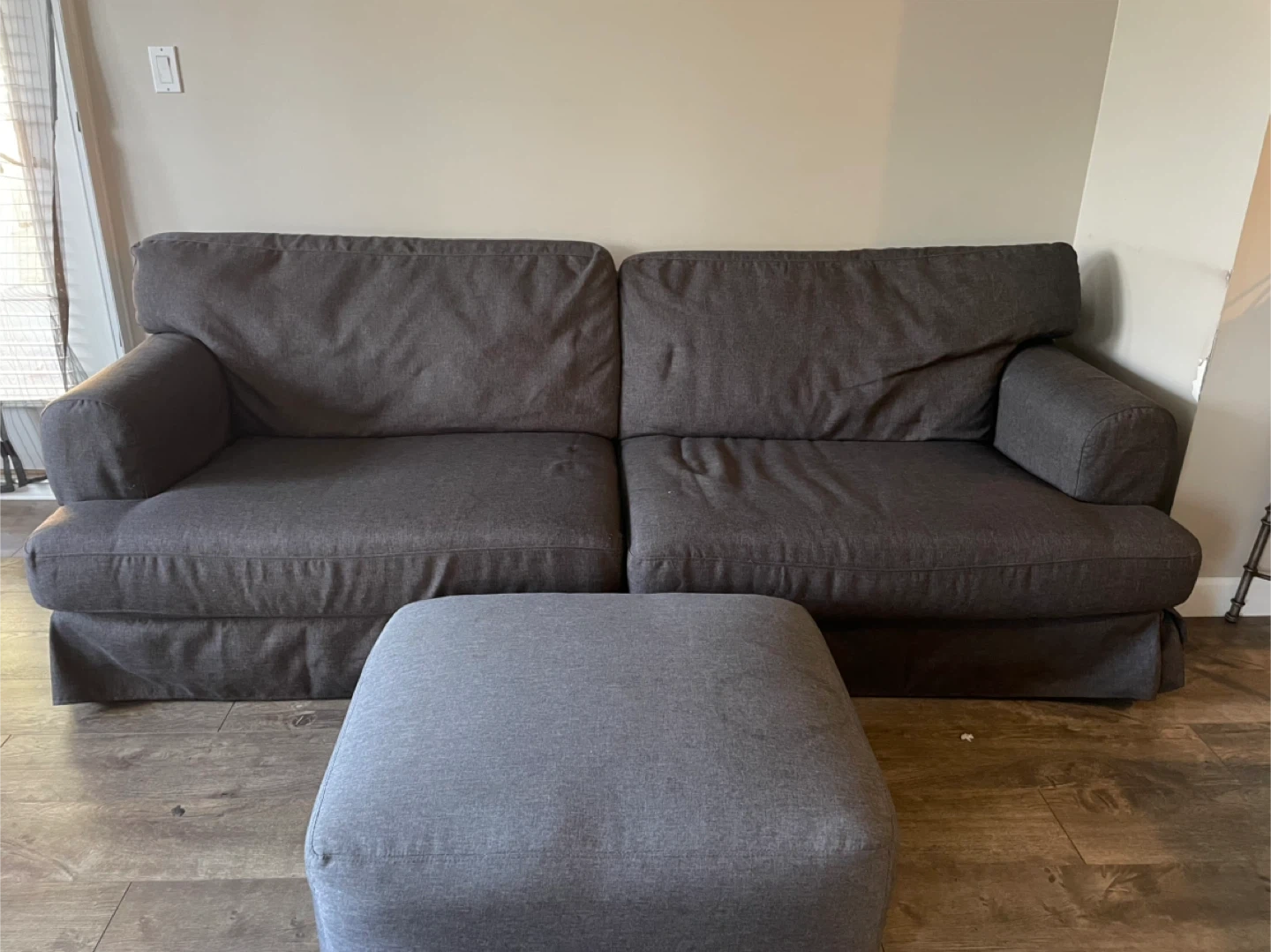 Selling sofa with a matching ottoman. The set is in a nice grey colour and is oversized. Perfect for a living room or den. It is sturdy and just have a few water marks