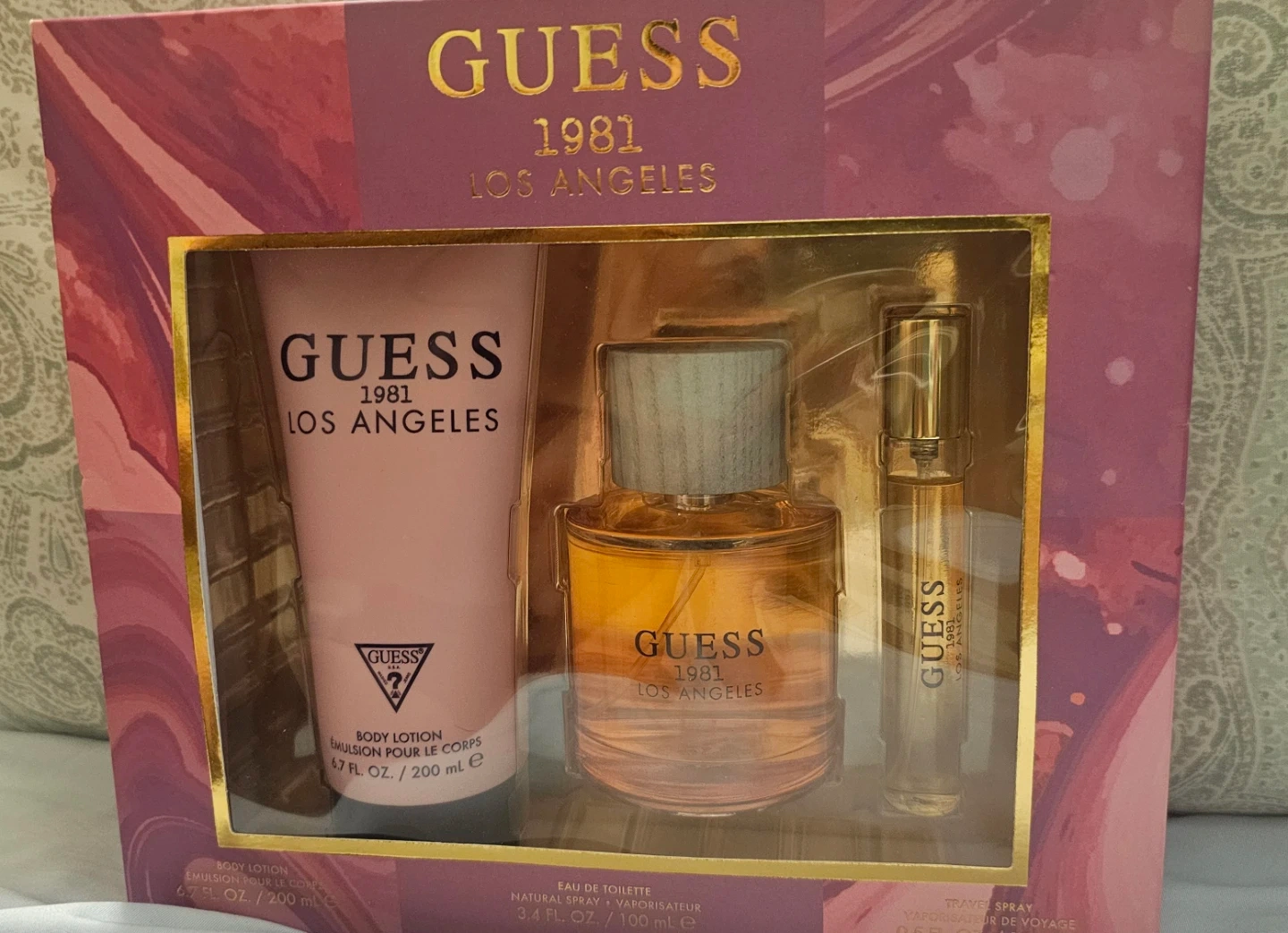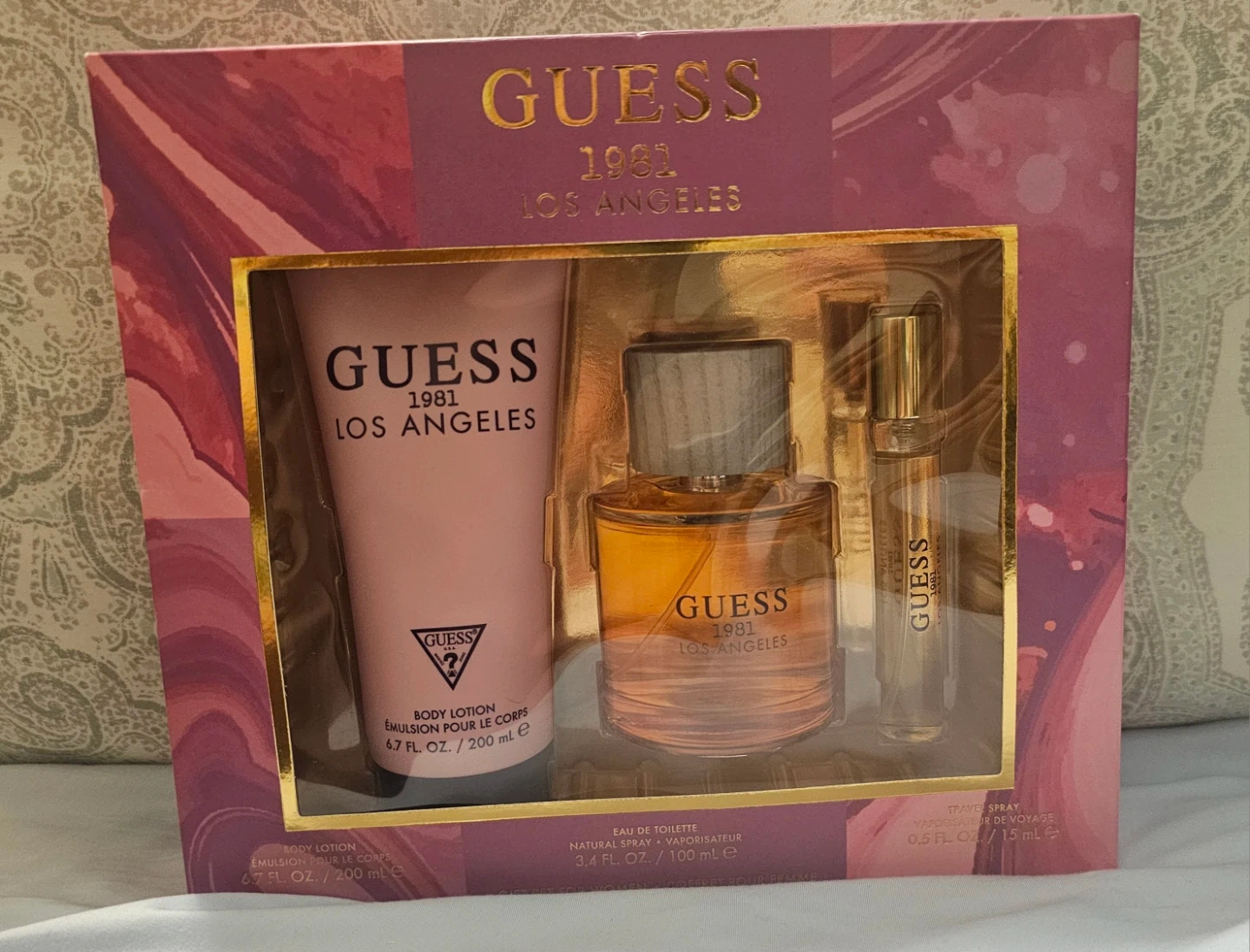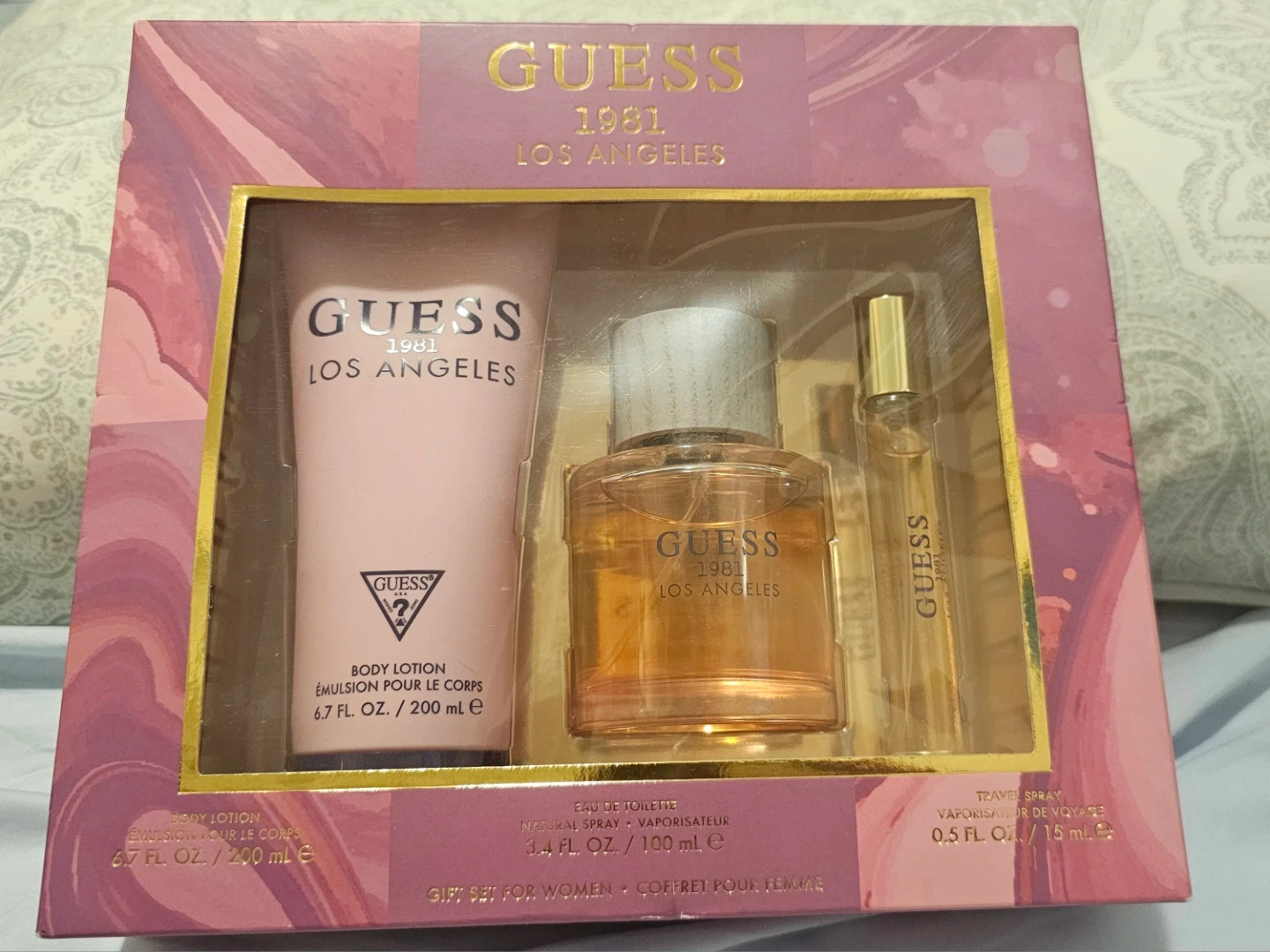 This Guess 1981 Los Angeles gift set for women includes a body lotion (6.7 fl oz / 200 mL), eau de toilette/Natural Spray (3.4 fl oz / 100 mL), and a travel spray (0.5 fl oz / 15 mL)