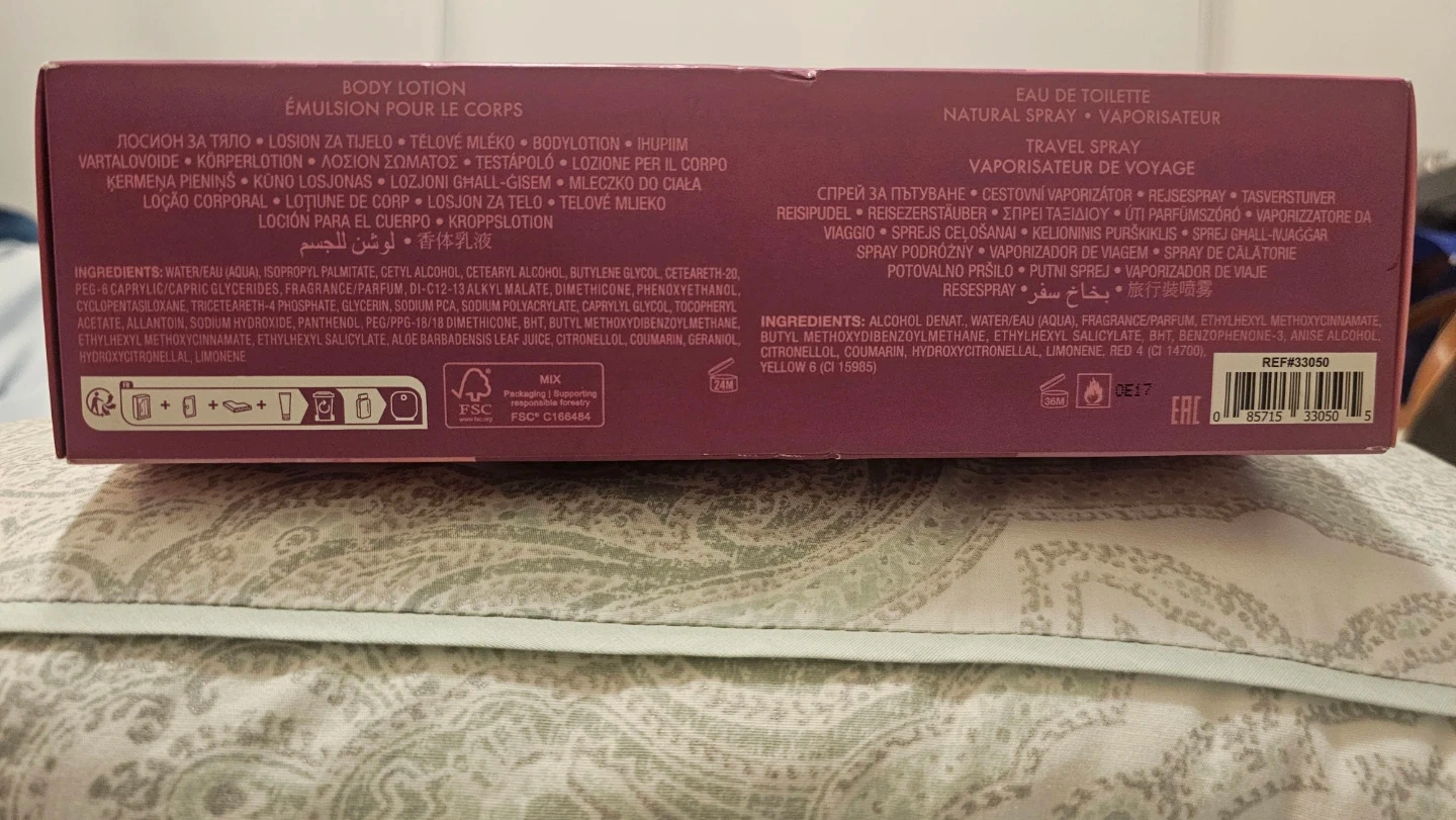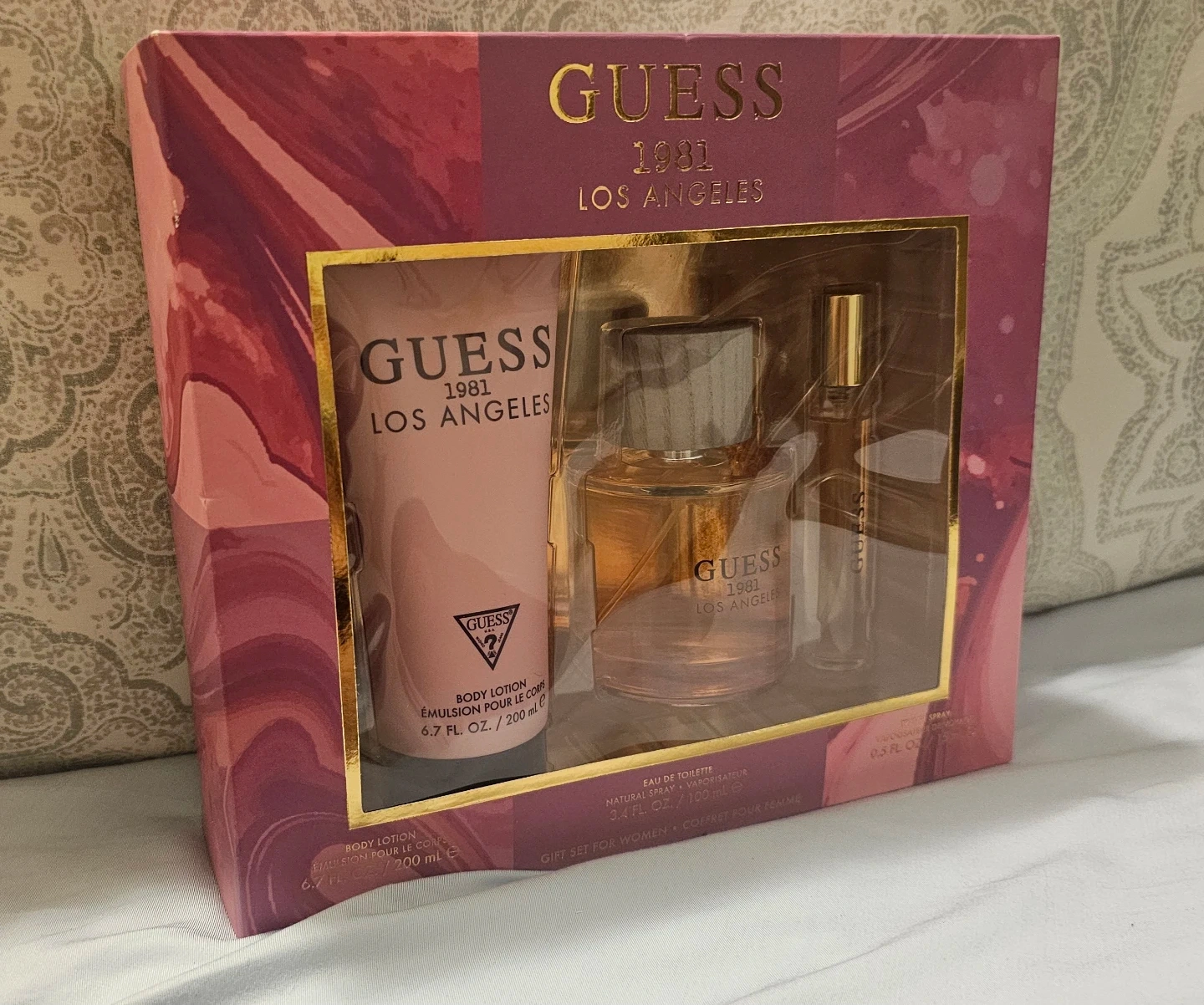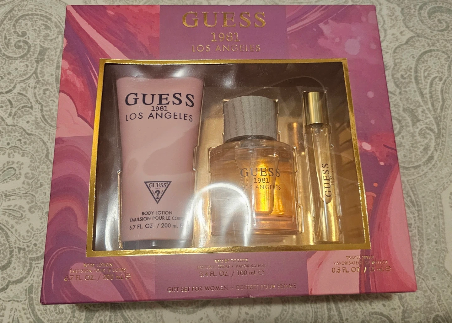 This Guess 1981 Los Angeles gift set for women includes a body lotion (6.7 fl oz / 200 mL), eau de toilette/Natural Spray (3.4 fl oz / 100 mL), and a travel spray (0.5 fl oz / 15 mL)