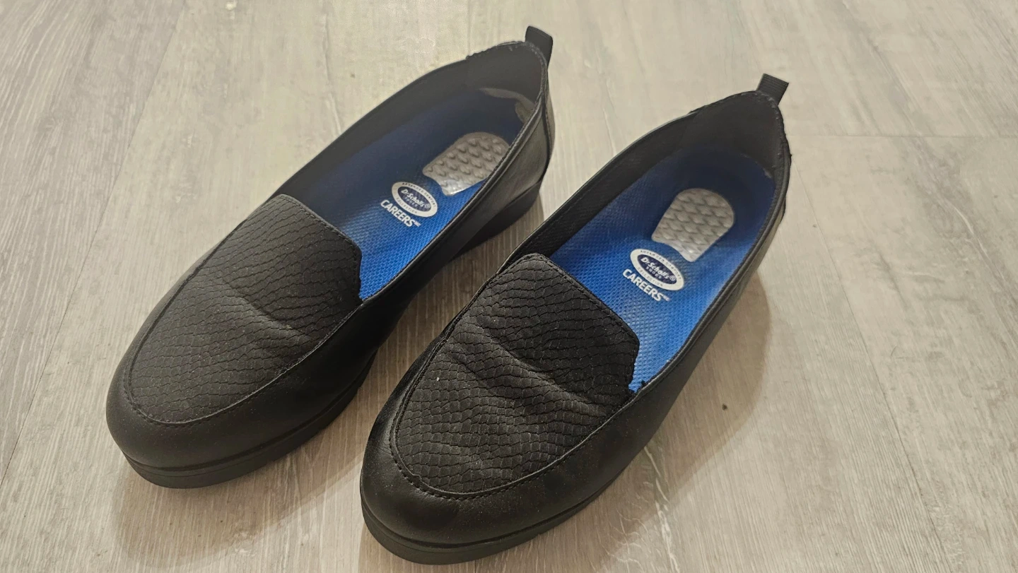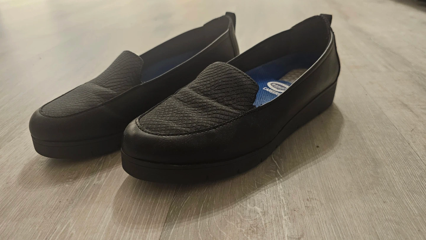 Selling a pair of Dr. Scholl's Careers loafers in black. These are a women's size 6W. They feature Advanced Comfort technology. Made with synthetic materials.