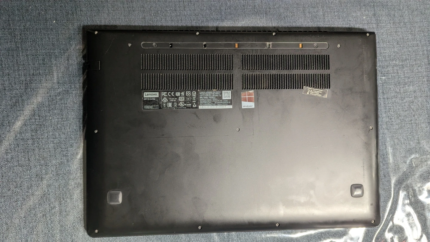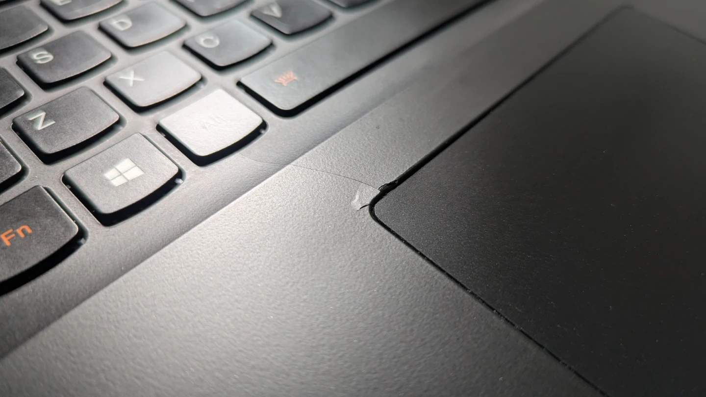 It has minor hairline crack damage next to the trackpad, and it's missing the grip strip from the bottom back