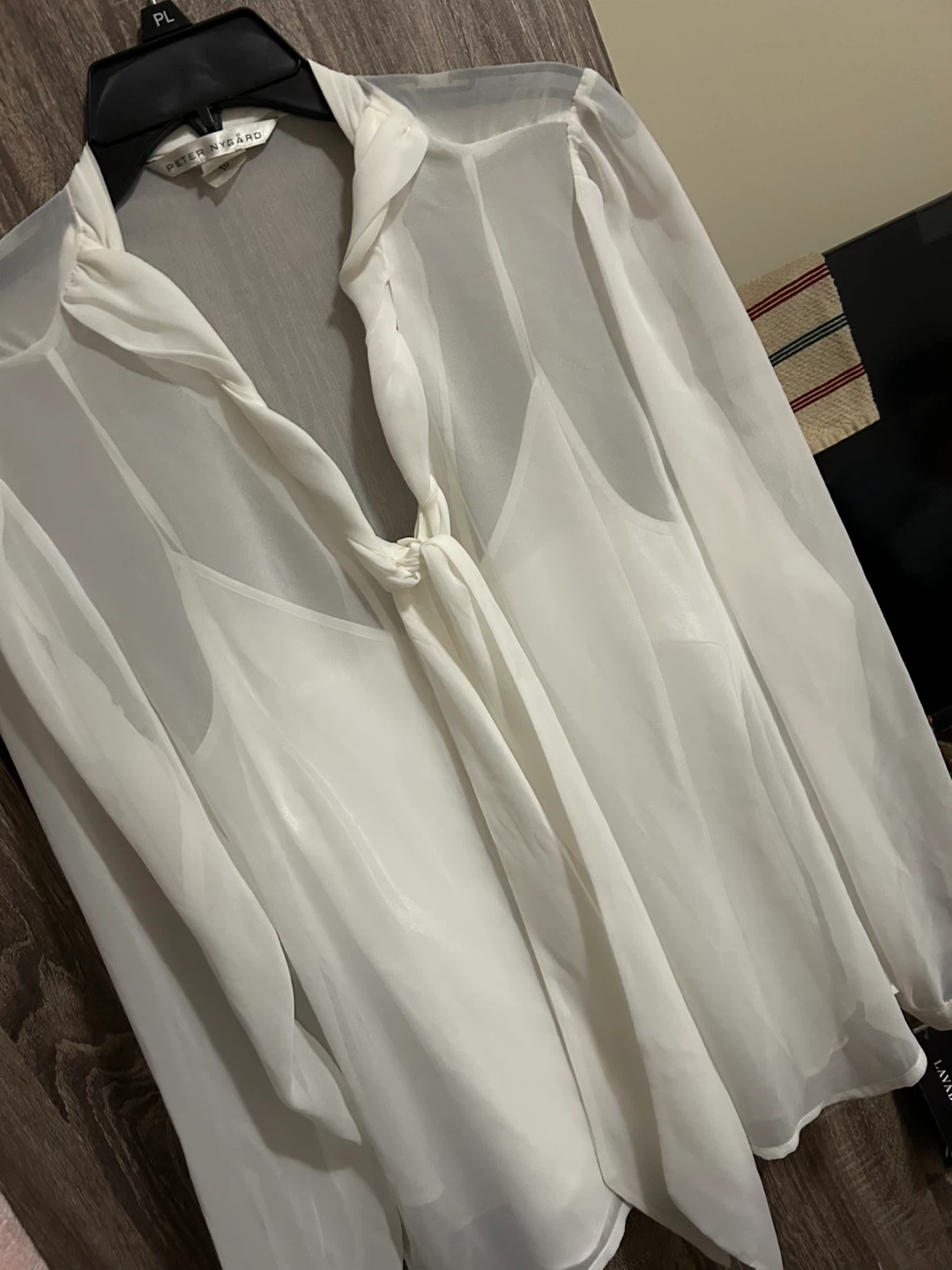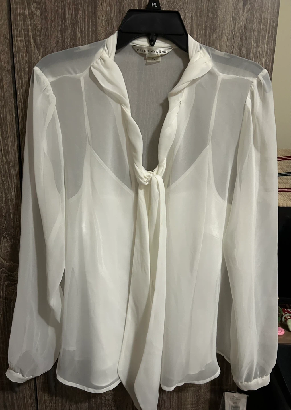 Selling a lovely Peter Nygard blouse in size 10. It's an ivory colour and has a unique twisted knot design at the neckline. Perfect for dressing up or down!