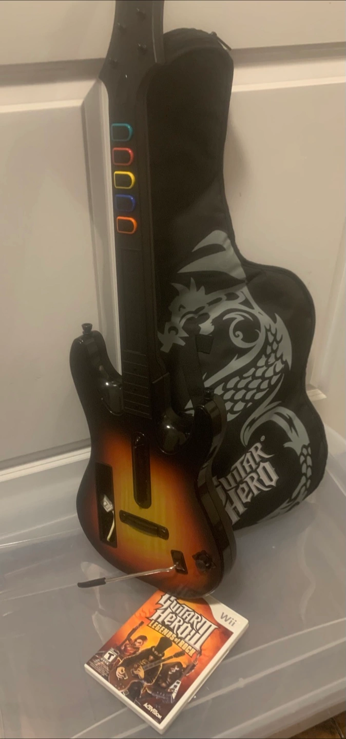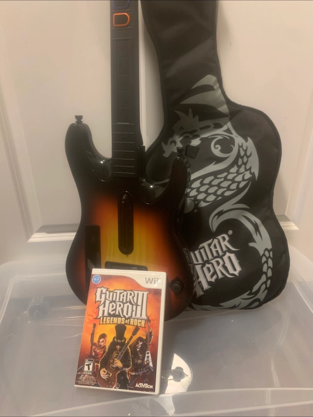 Selling a Nintendo Wii Guitar Hero guitar with its case and Guitar Hero III Legends of Rock game for the Wii. Everything is in good condition and ready for a new rocker!