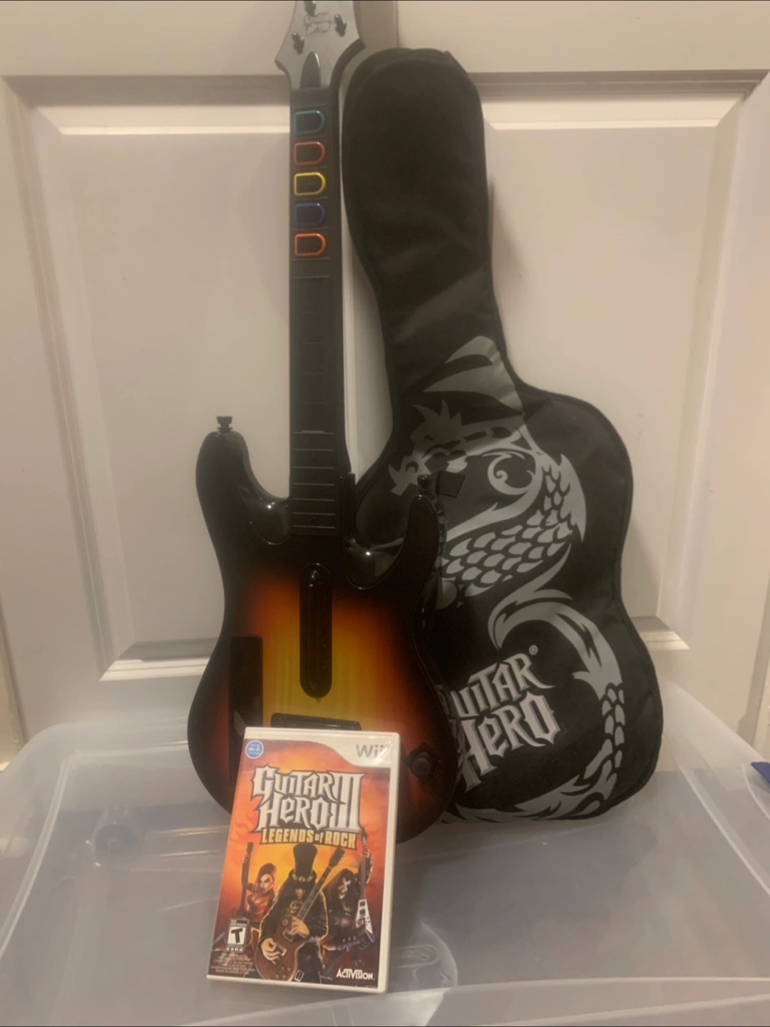 Selling a Nintendo Wii Guitar Hero guitar with its case and Guitar Hero III Legends of Rock game for the Wii. Everything is in good condition and ready for a new rocker!