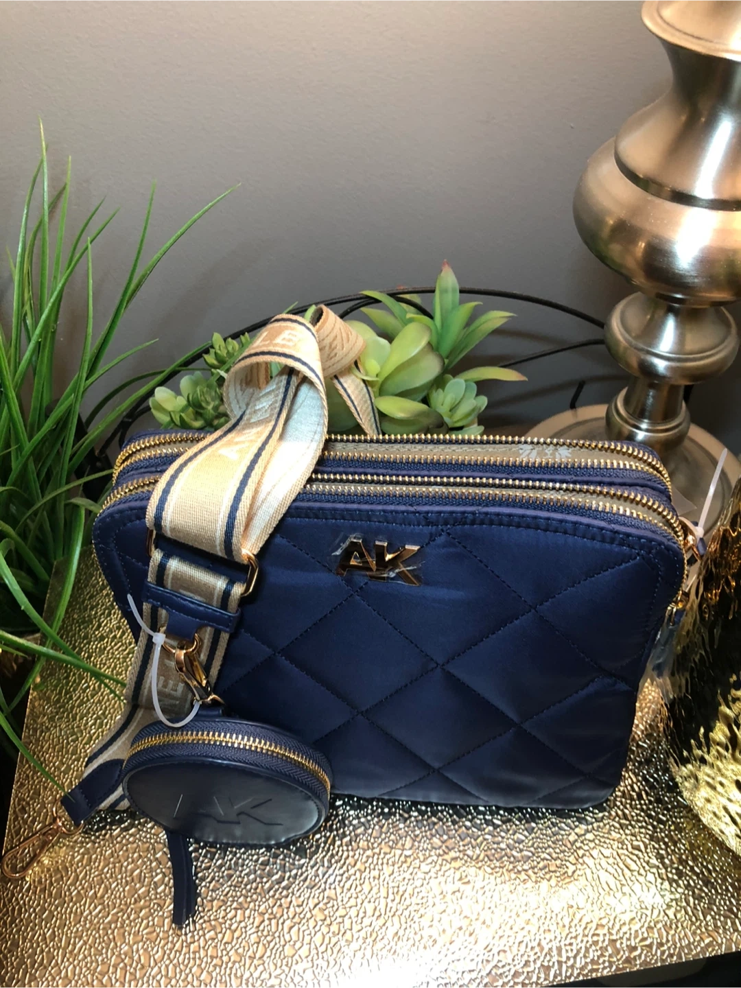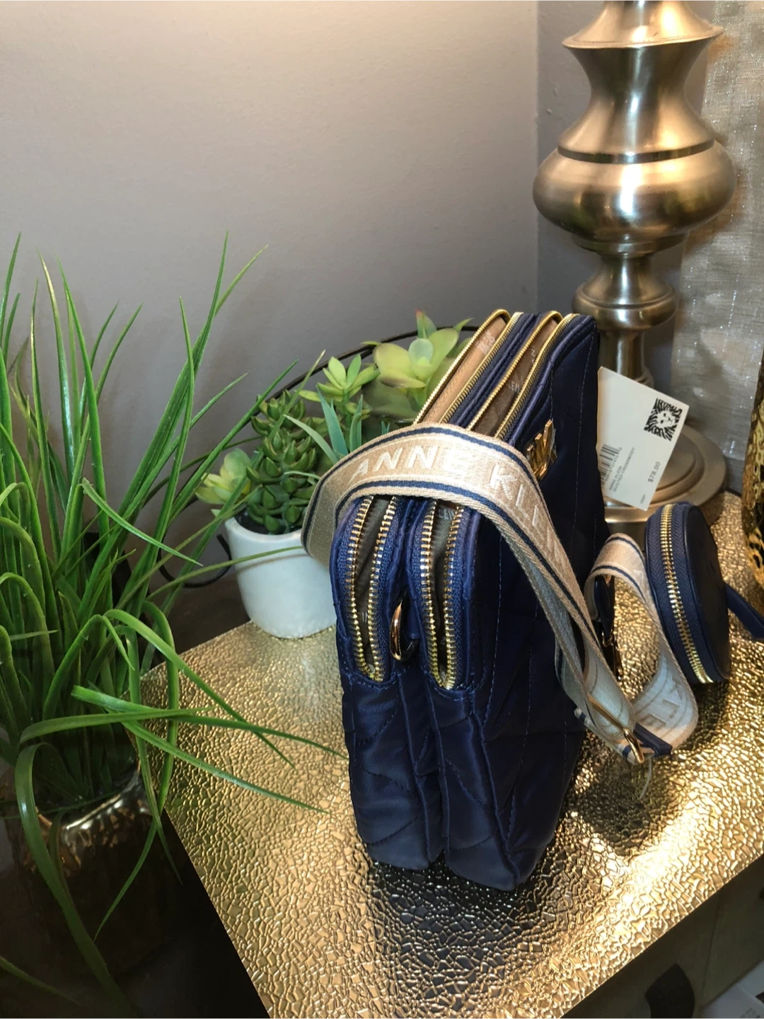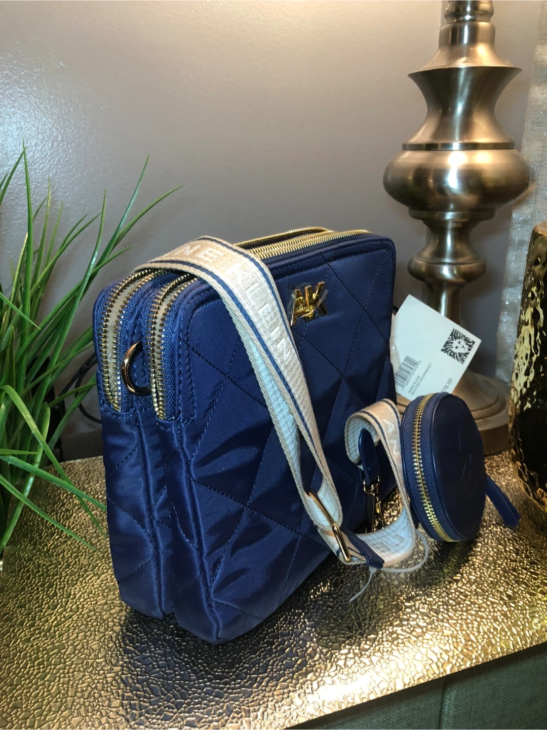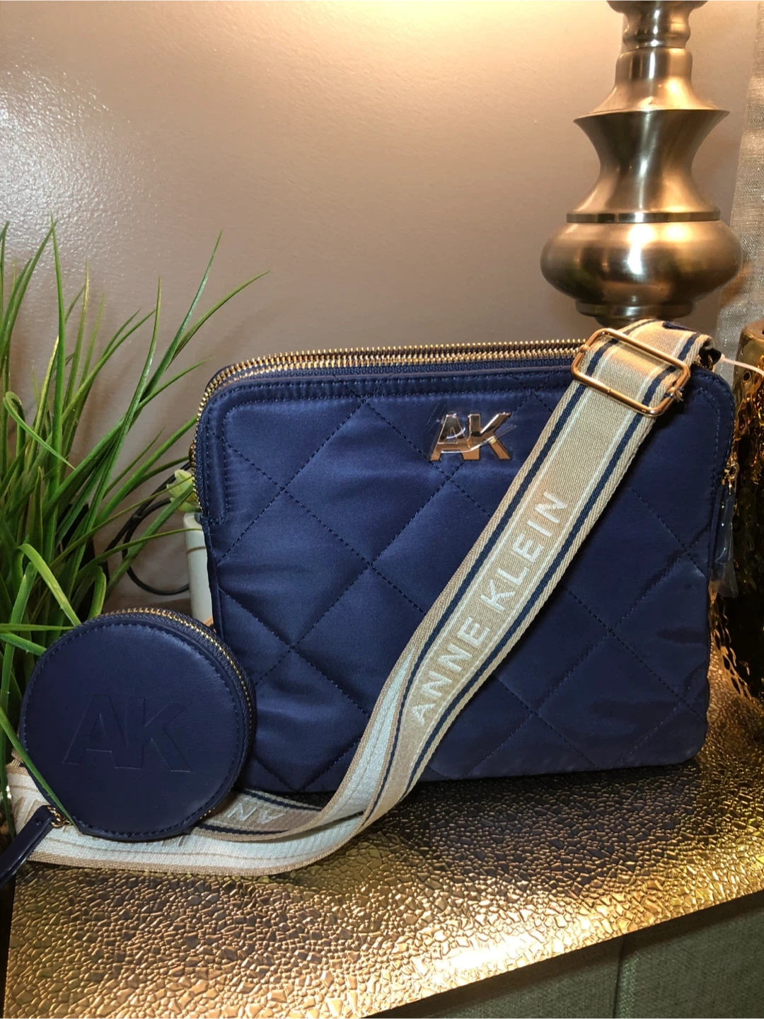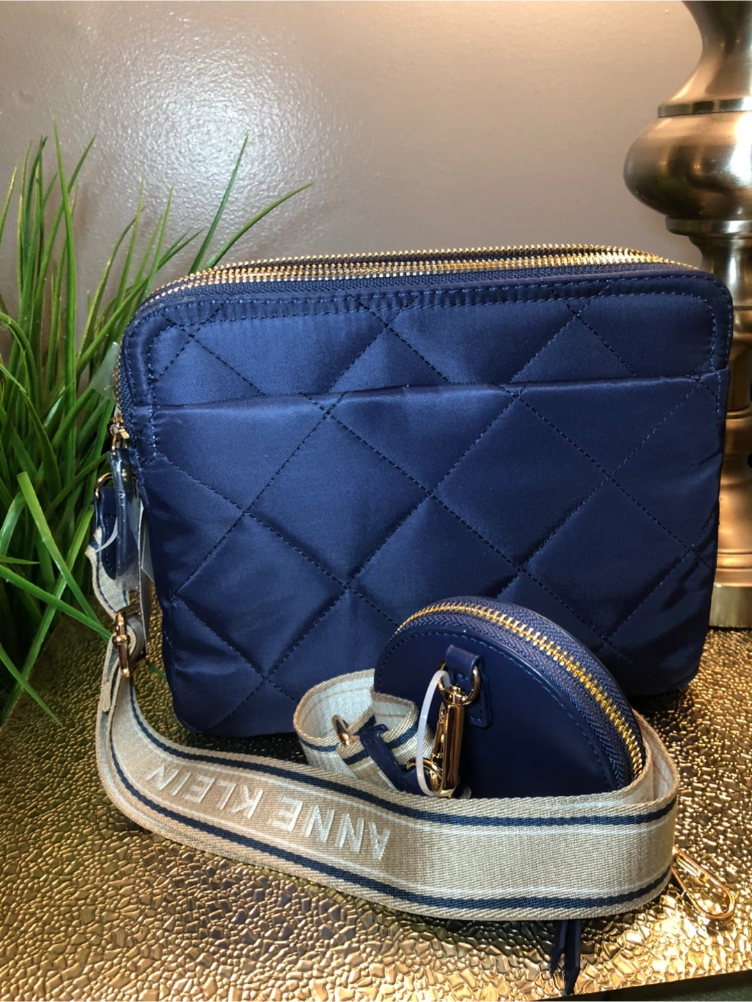 This is a beautiful Anne Klein quilted crossbody bag in a lovely navy blue color. It comes with a matching coin purse and a stylish strap with the Anne Klein name on it. Perfect for adding a touch of elegance to any outfit!