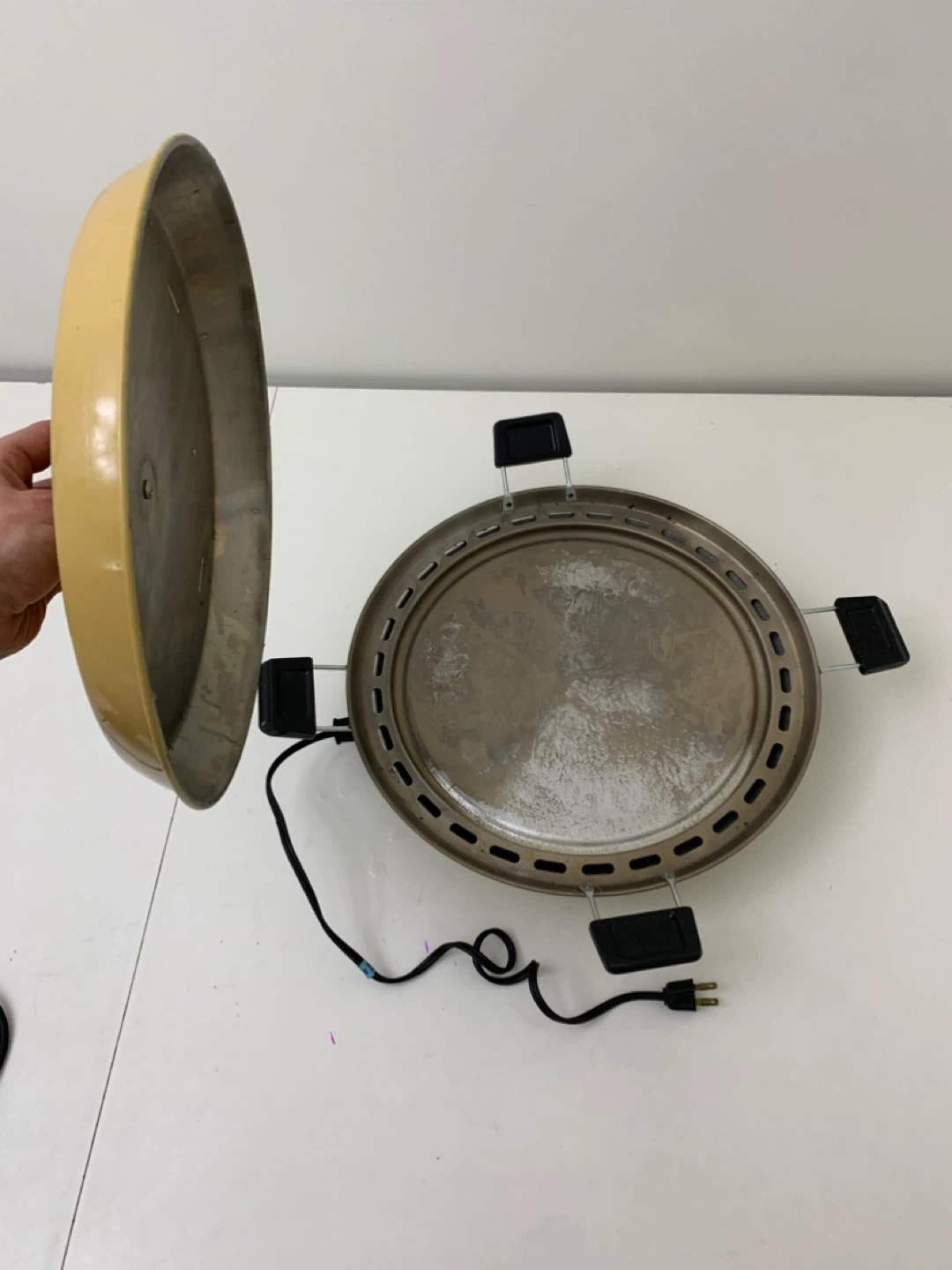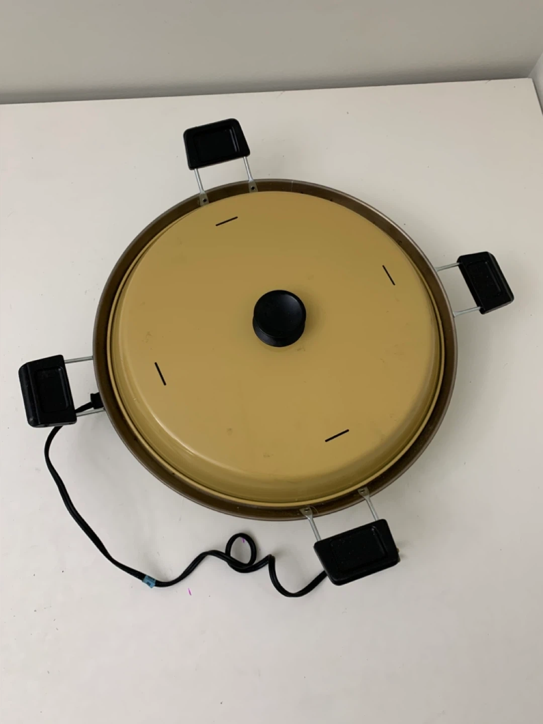 Selling a vintage raclette grill with a lid! It shows some signs of use, but it is still in good working condition. Perfect for a fun dinner with friends or family.