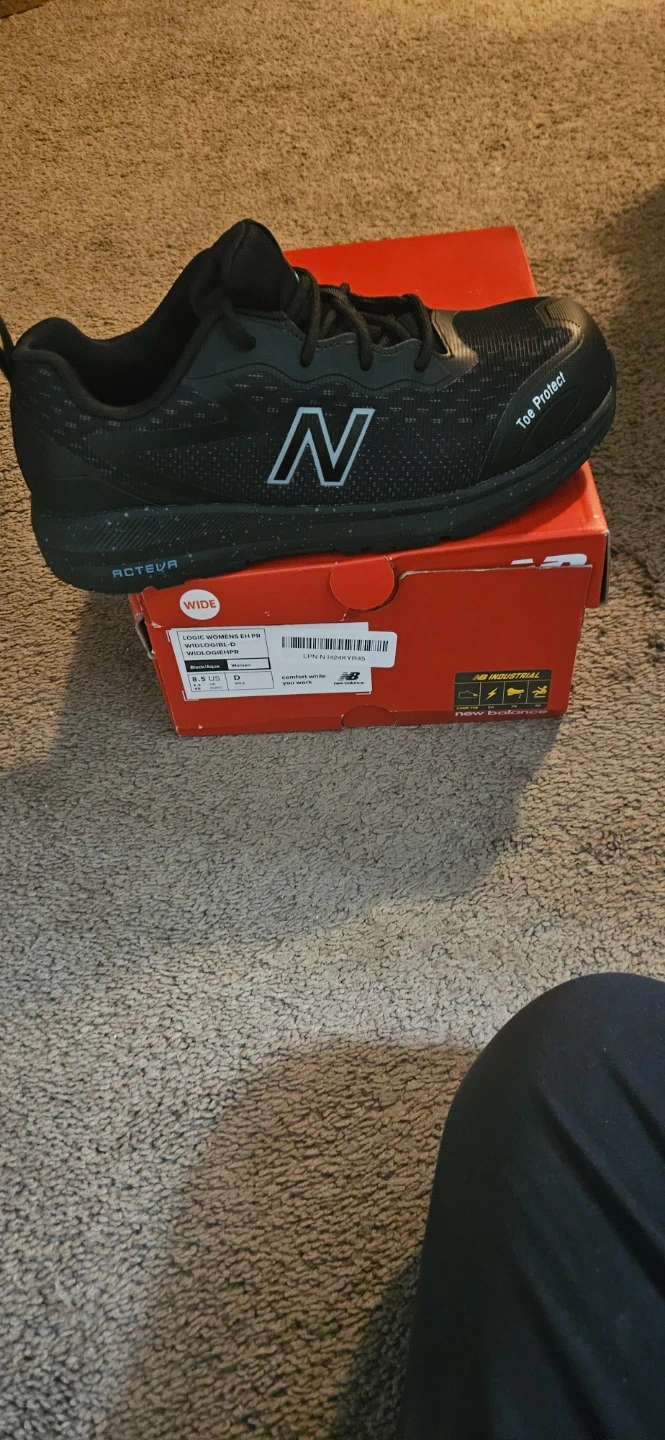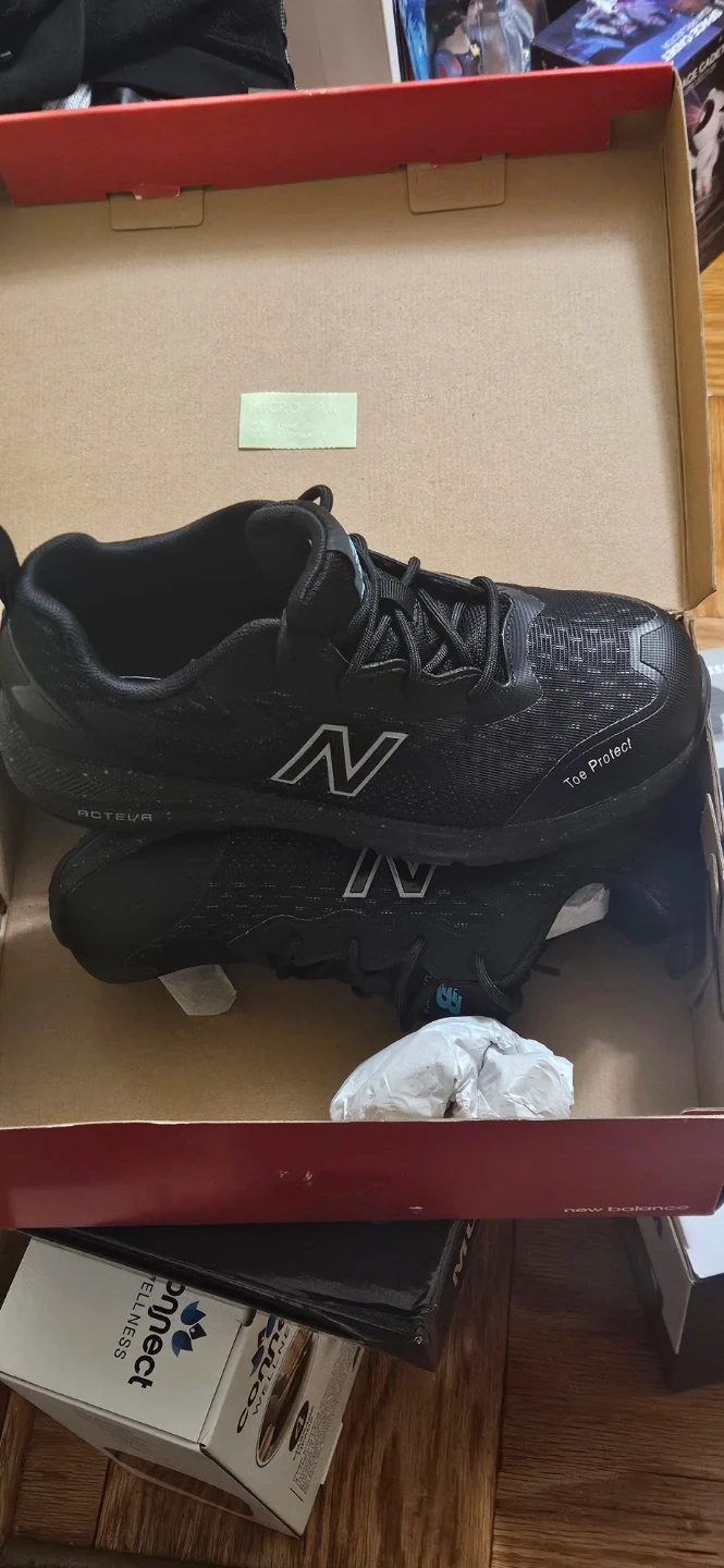Selling a pair of New Balance shoes in black. These are size 8.5 D. They come with toe protect. They are in the original box. NEVER USED