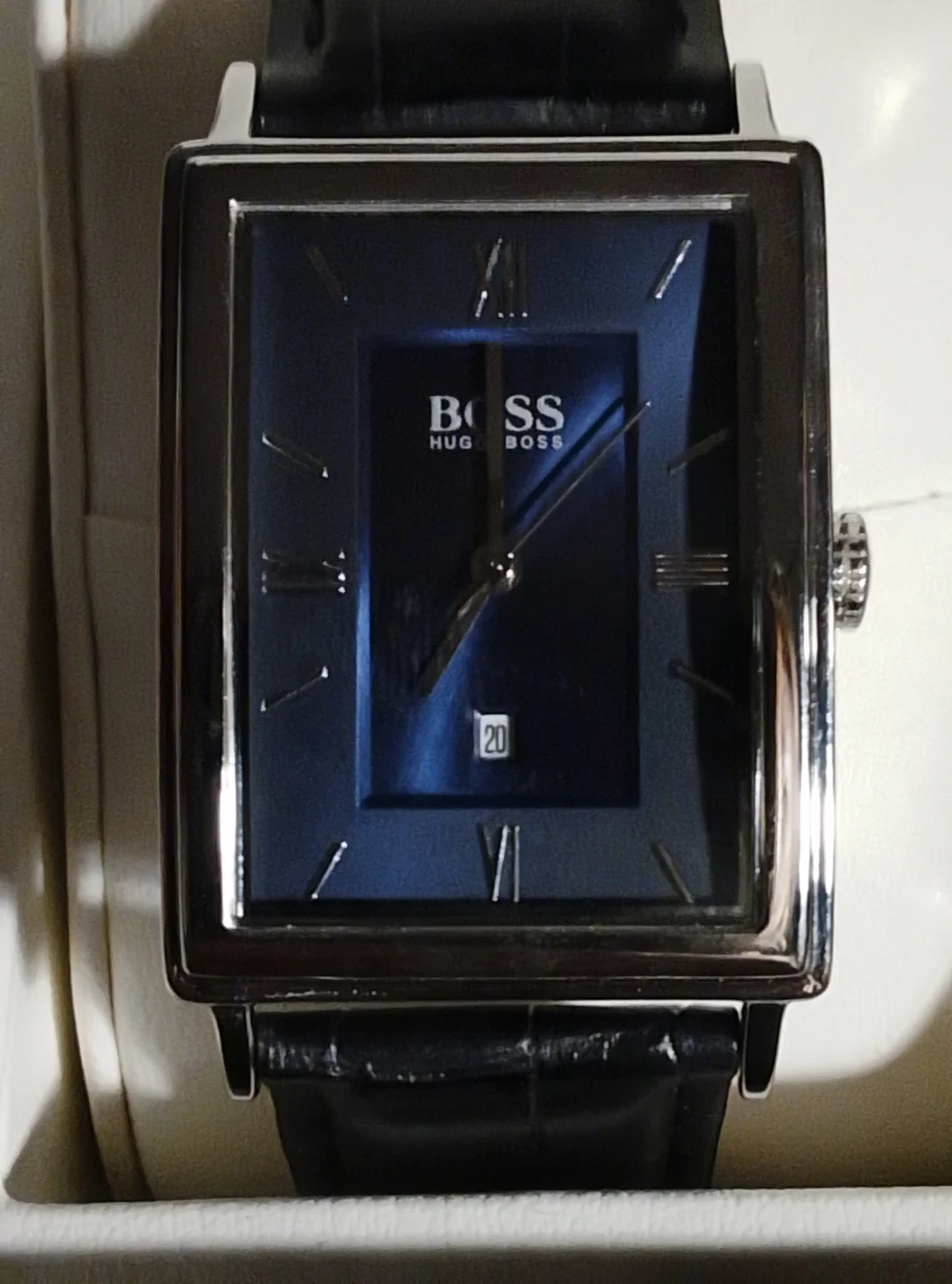 Selling a Hugo Boss watch with a black leather strap. It's in new condition and comes with the box. The watch features a sleek, rectangular design with a blue face. Box has some wear and tear on it