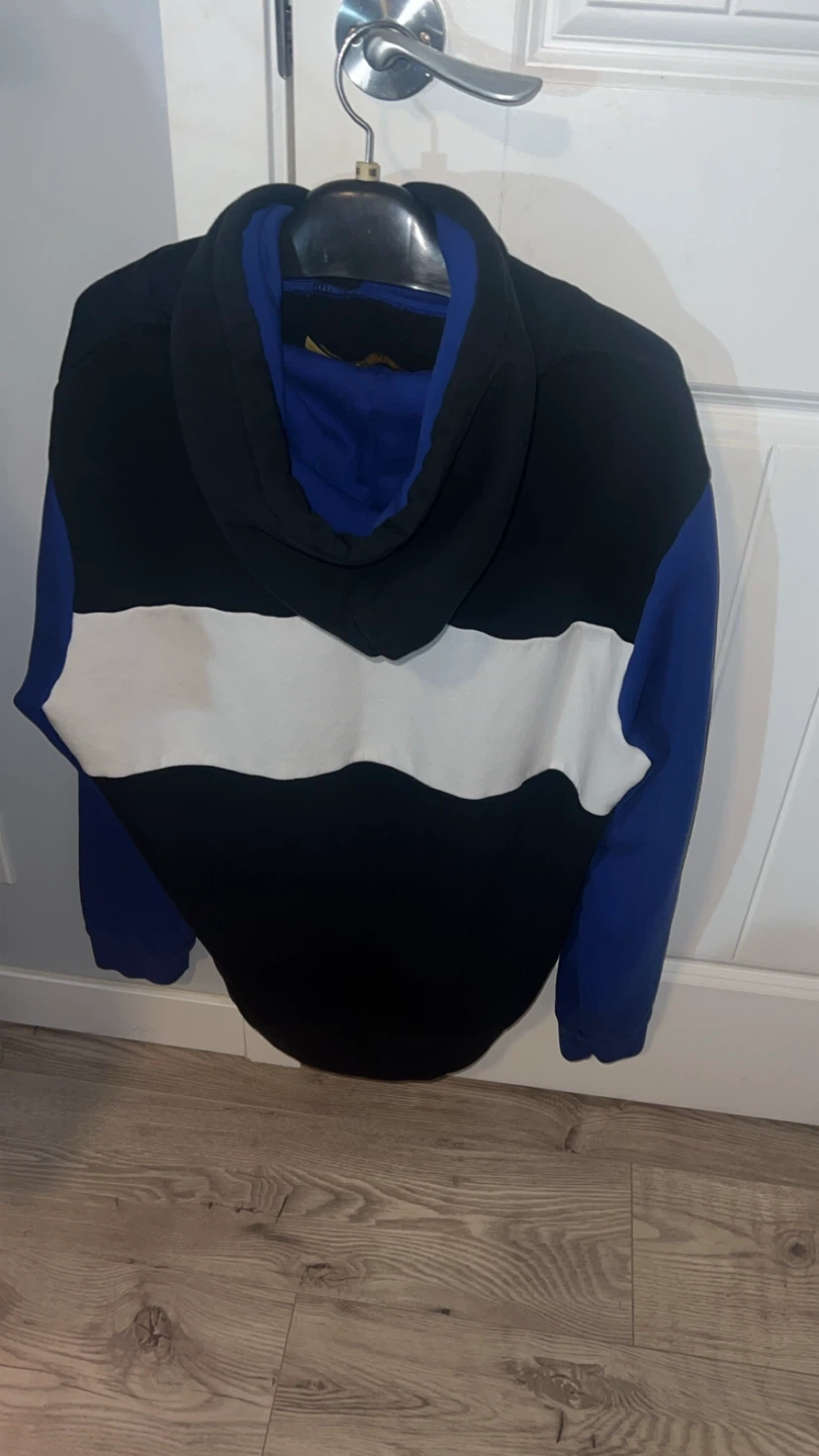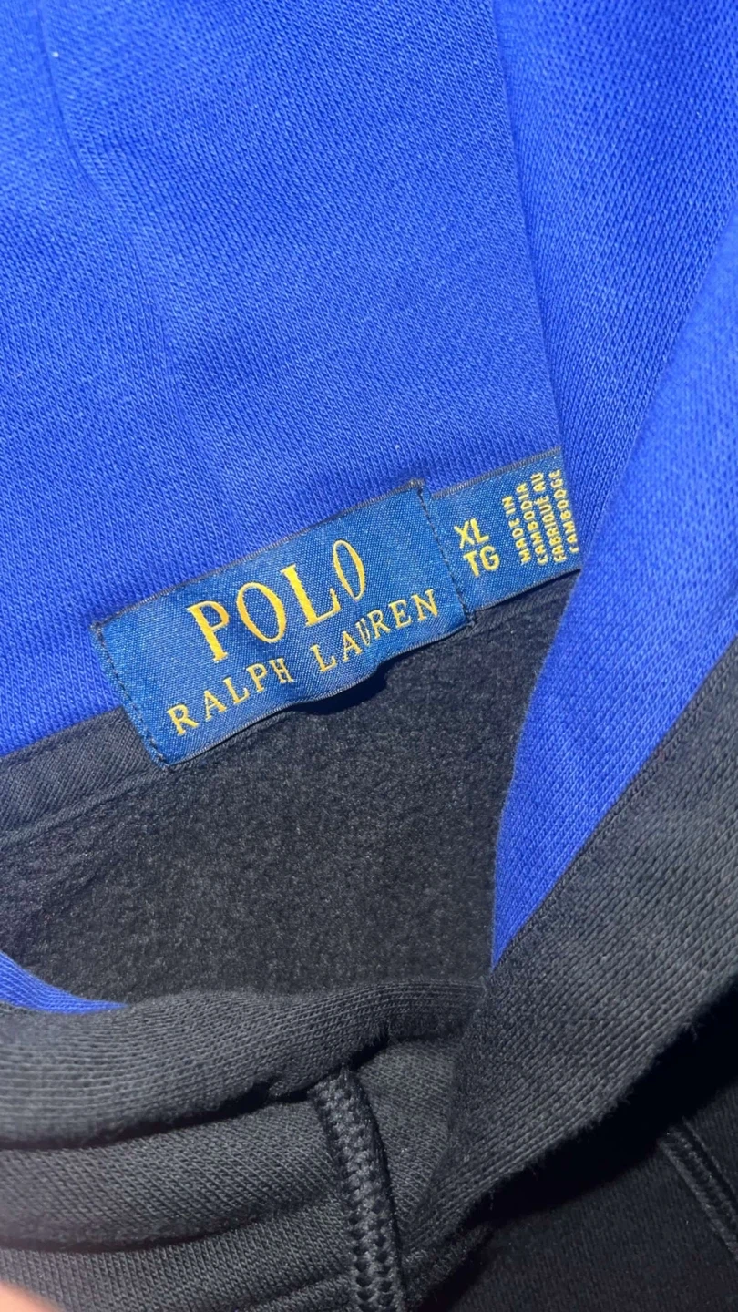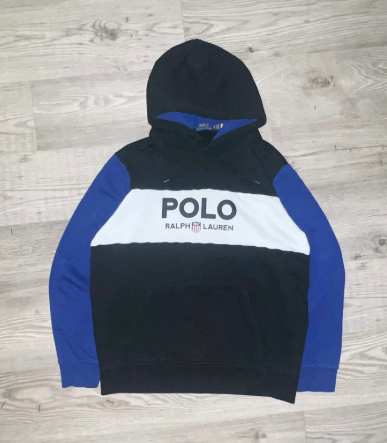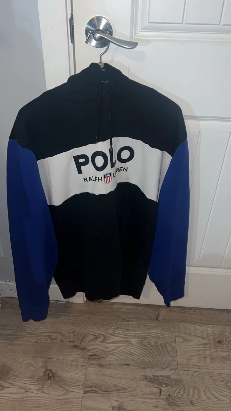 Selling a Polo Ralph Lauren colour block hoodie. It's in great condition and is a size XL. The hoodie features a black body, white chest stripe with the Polo Ralph Lauren logo, and blue sleeves. Perfect for staying warm and stylish!