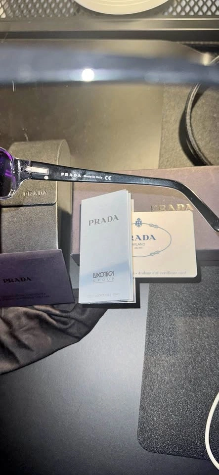 Comes with the box, the case for the glasses, authentication card and the Prada lens cloth.