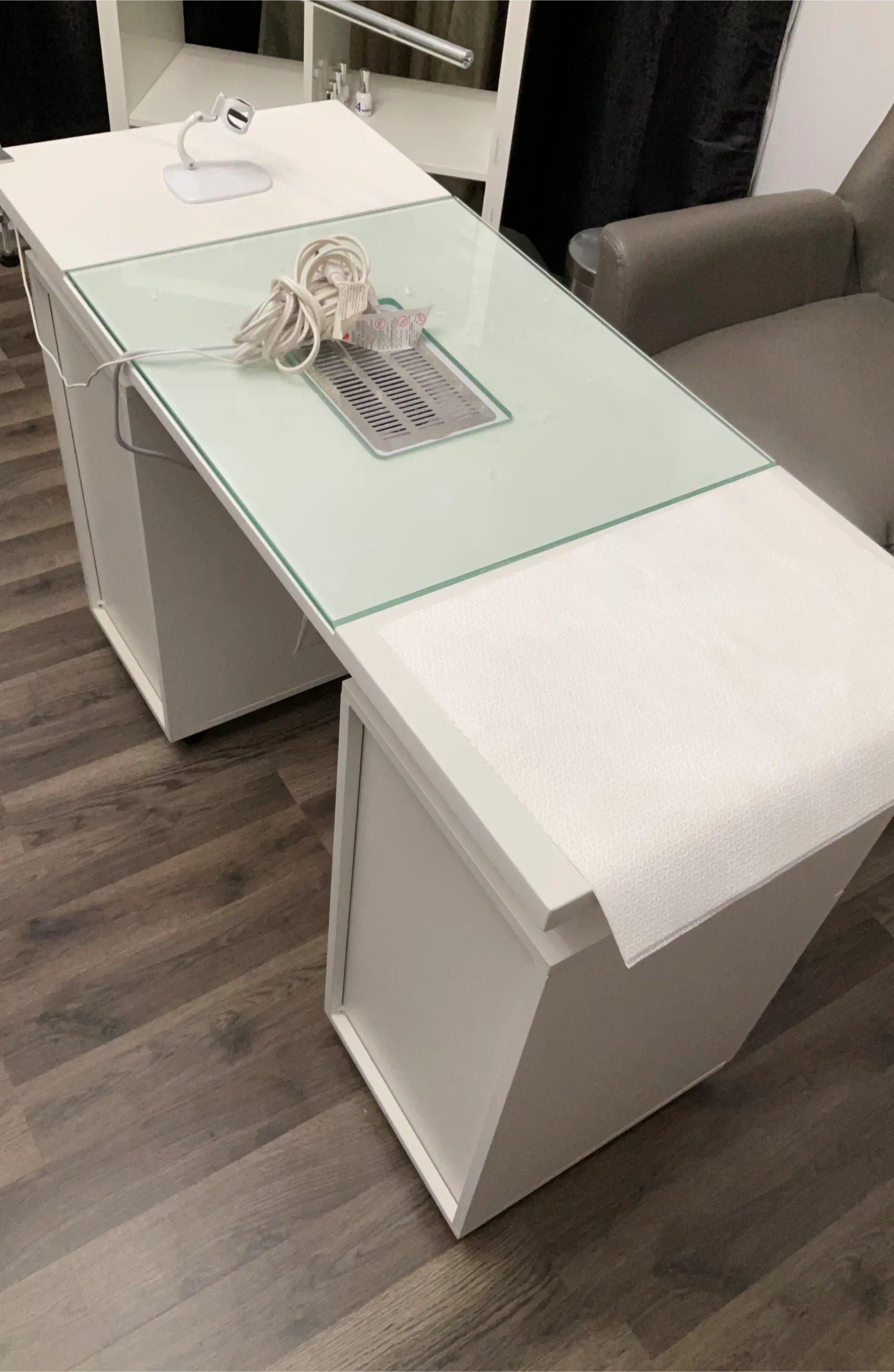 Selling a white nail manicure table. It features a built-in light and a vent for dust collection. Perfect for any nail salon or home setup!