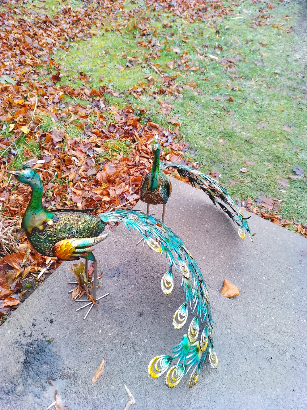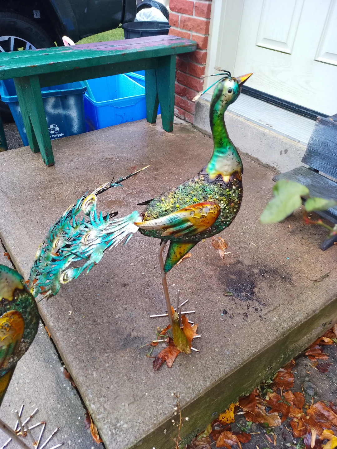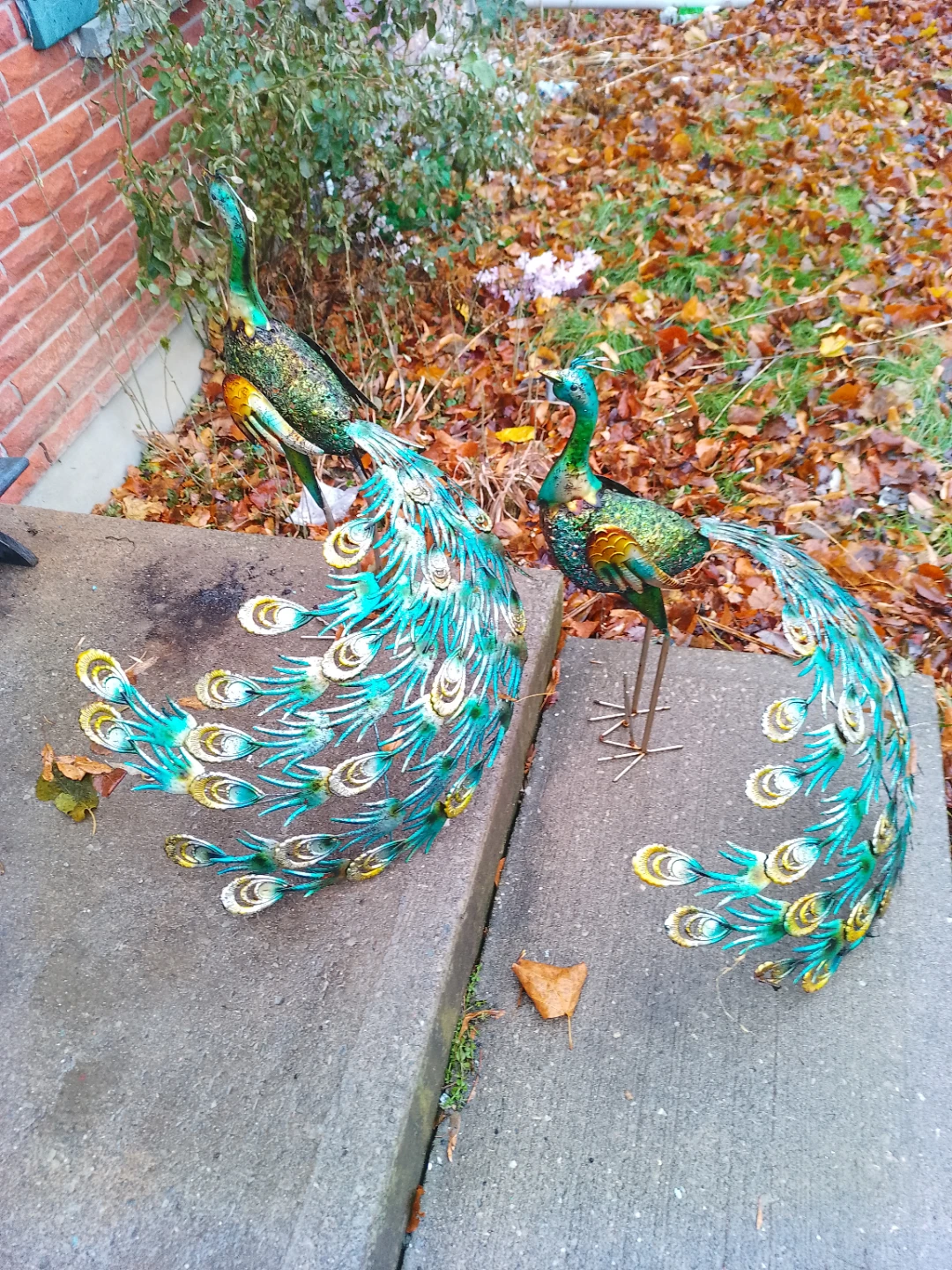 These vibrant metal peacock garden decorations are sure to add a pop of colour to your outdoor space! They're in great condition and ready to brighten up your garden or patio