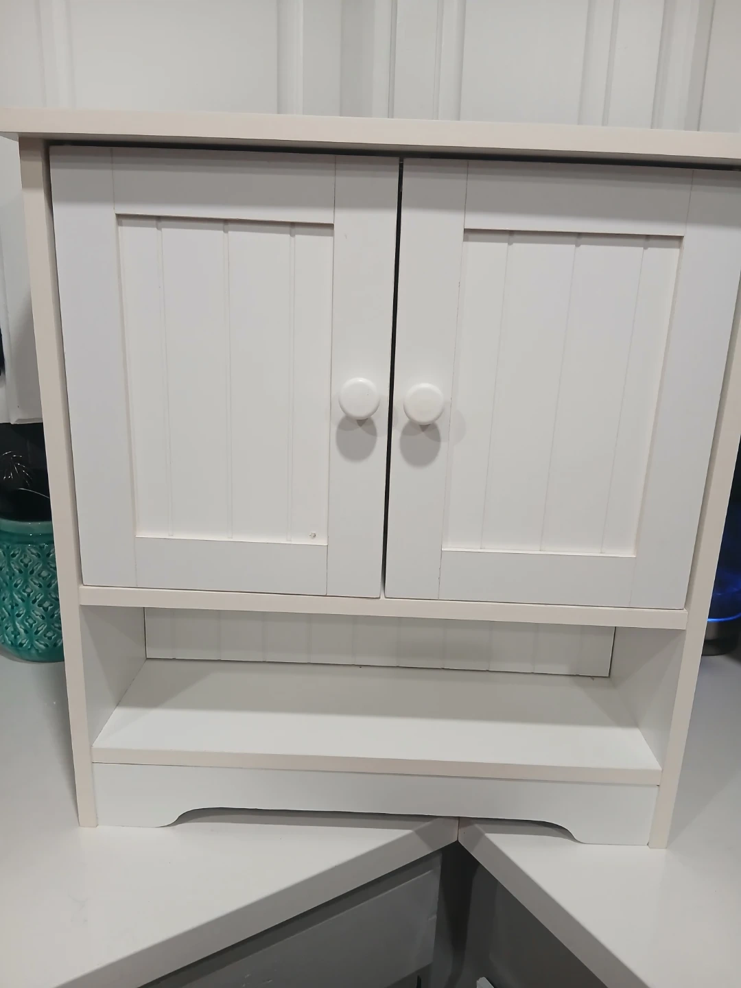 Here's a cute white wooden wall cabinet, perfect for adding some extra storage. It's in great shape and ready to be installed in your home. It features a two-door cabinet on top and an open shelf at the bottom.