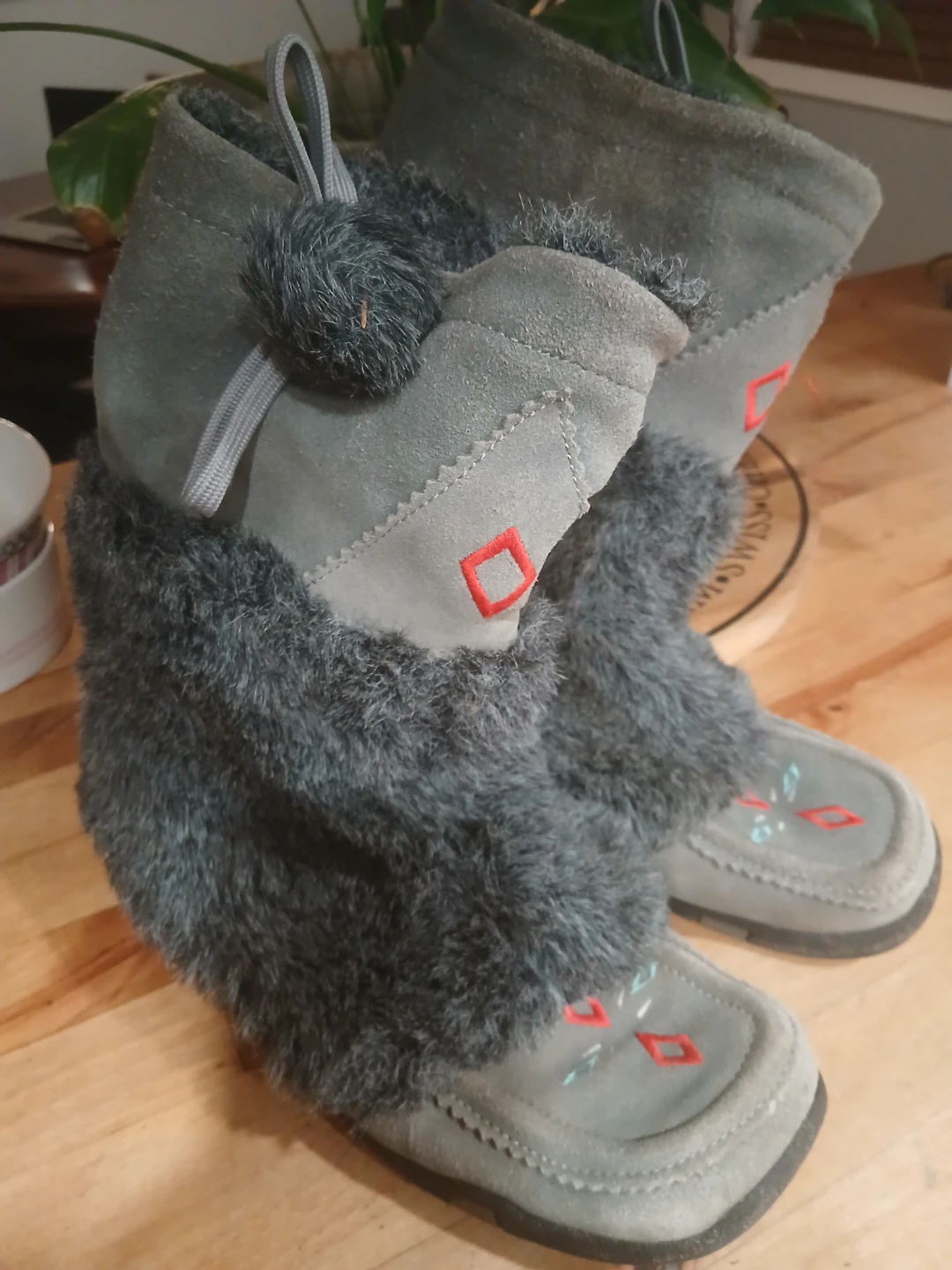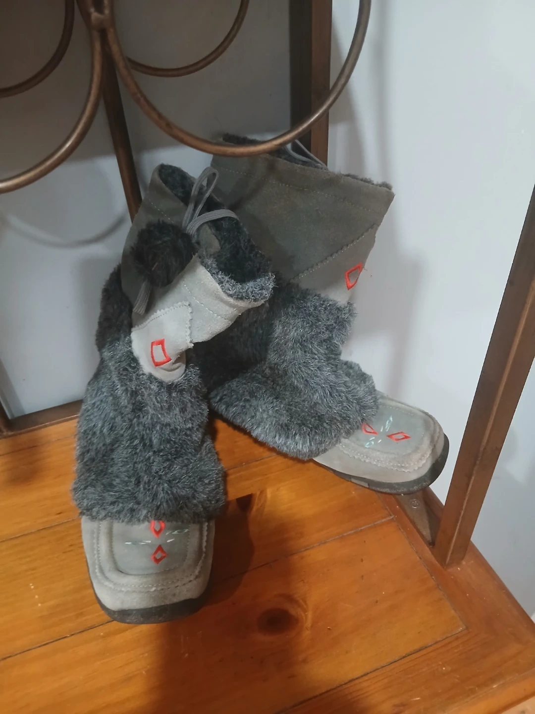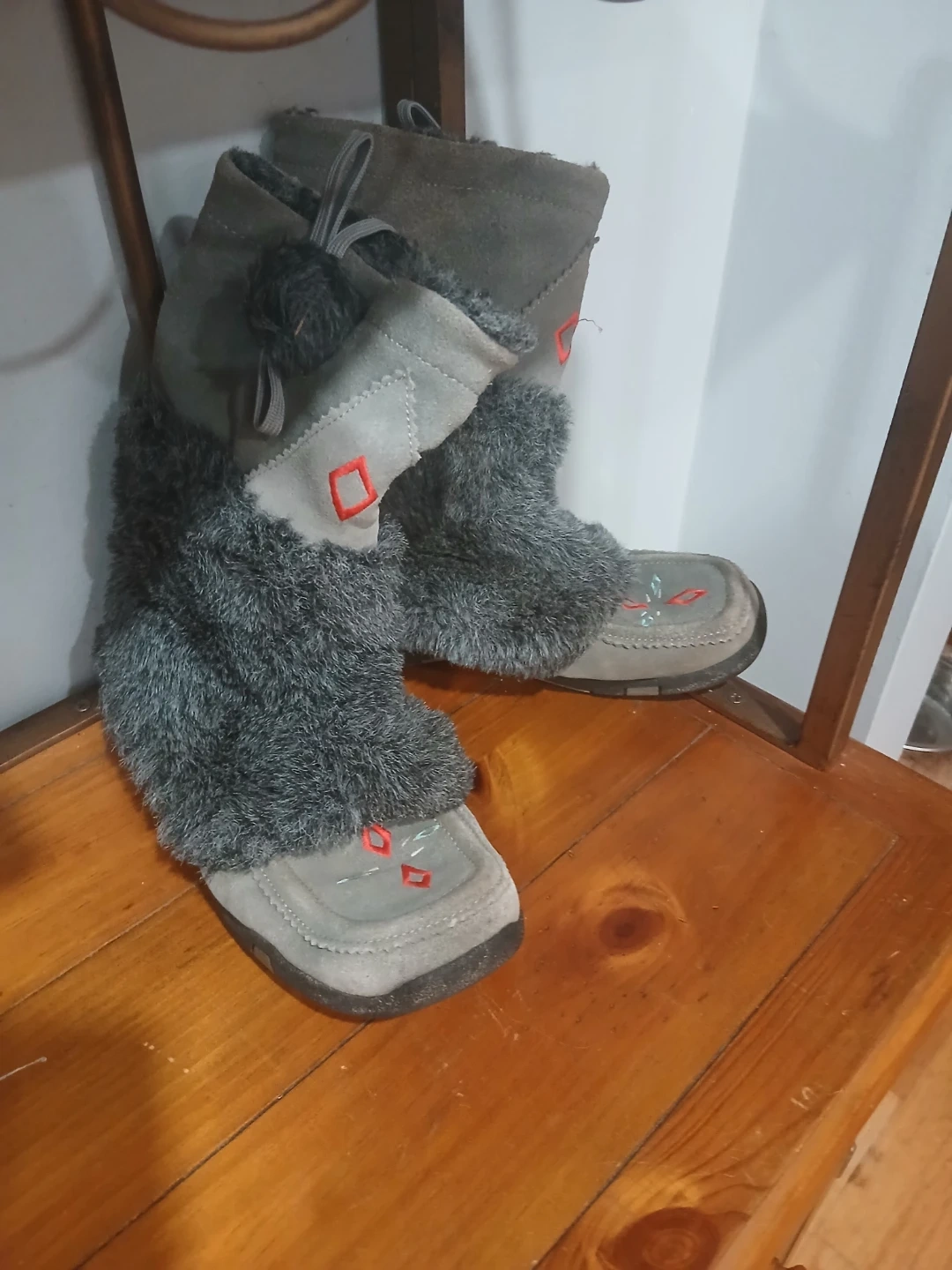 These gently used boots are made of a grey suede material and feature a soft faux fur trim. They have a unique design with red diamond accents. The soles show some wear, but overall they're in good condition and ready for some cozy winter adventures.Very expensive new.