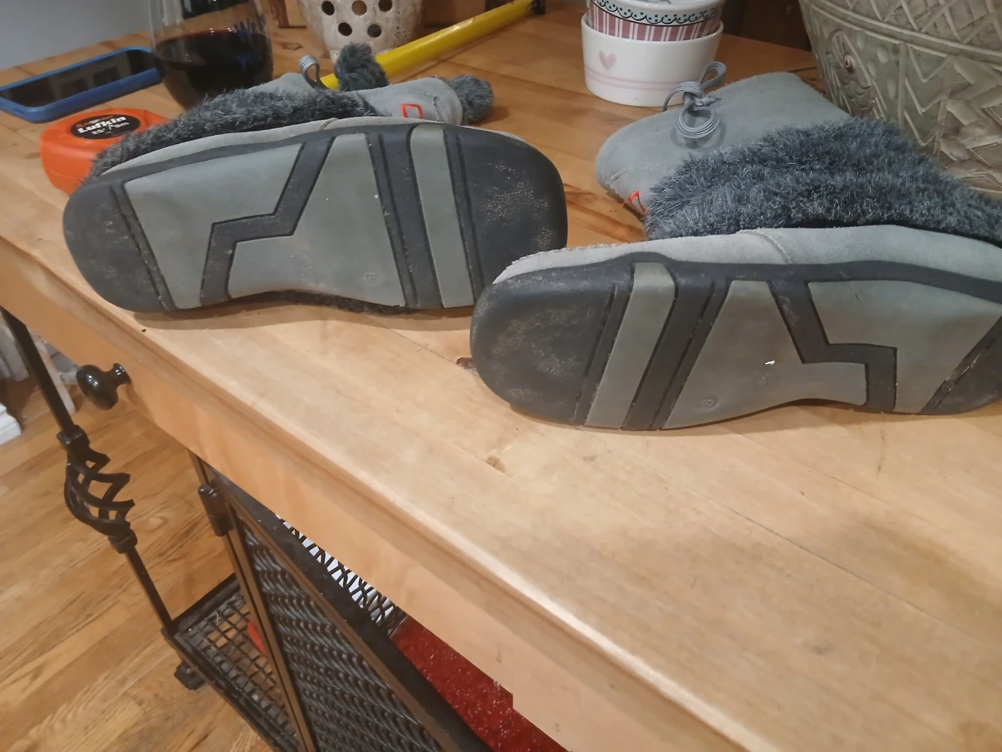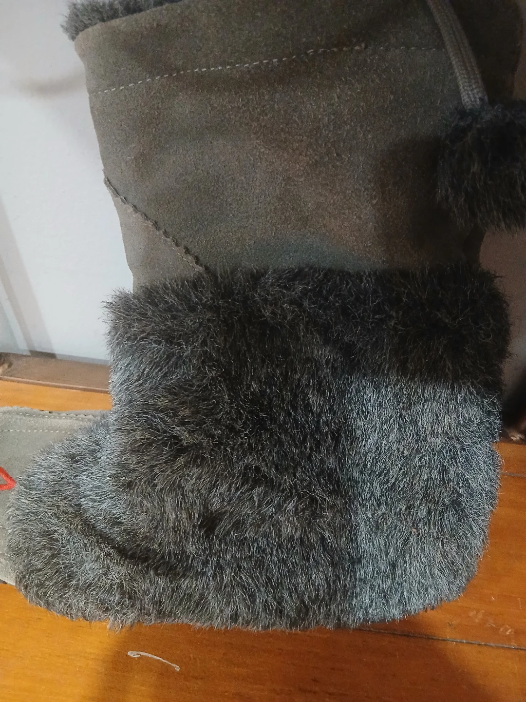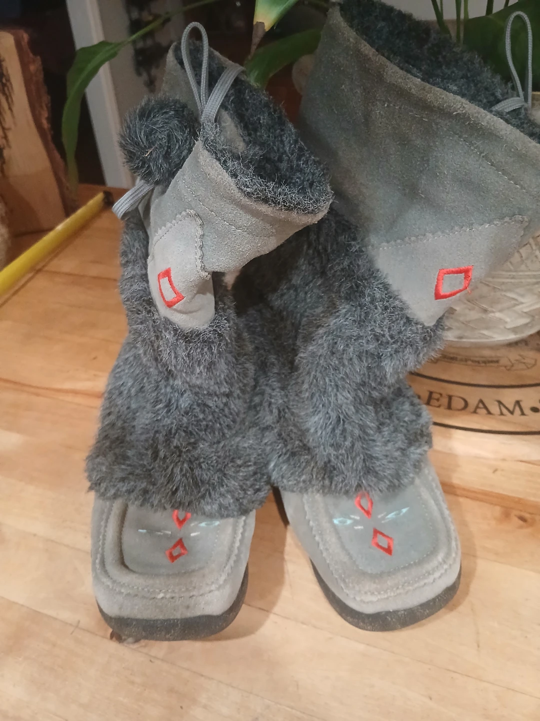 These gently used boots are made of a grey suede material and feature a soft faux fur trim. They have a unique design with red diamond accents. The soles show some wear, but overall they're in good condition and ready for some cozy winter adventures.Very expensive new.