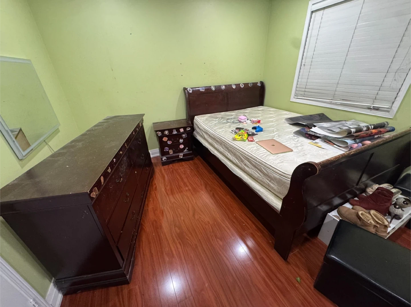 Selling a bedroom set that includes a queen bed, a dresser, chest and 2x nightstand. The set is in used condition with some signs of wear and tear. Perfect for someone looking for a complete bedroom setup!