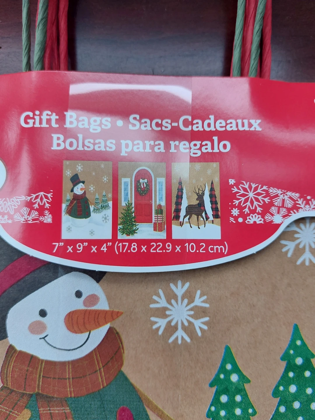 These are Christmas gift bags. There are 3 in a pack. The size is 7" x 9" x 4" (17.8 x 22.9 x 10.2 cm)