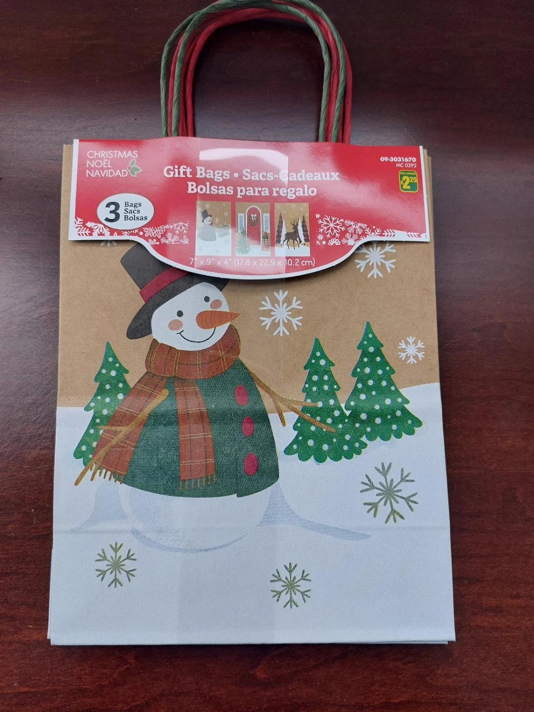 These are Christmas gift bags. There are 3 in a pack. The size is 7" x 9" x 4" (17.8 x 22.9 x 10.2 cm)
