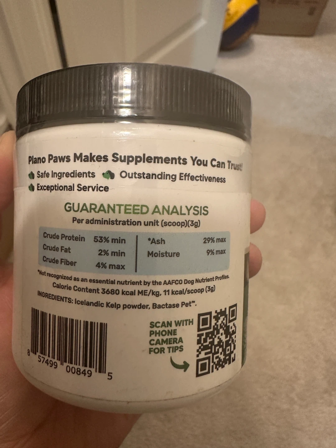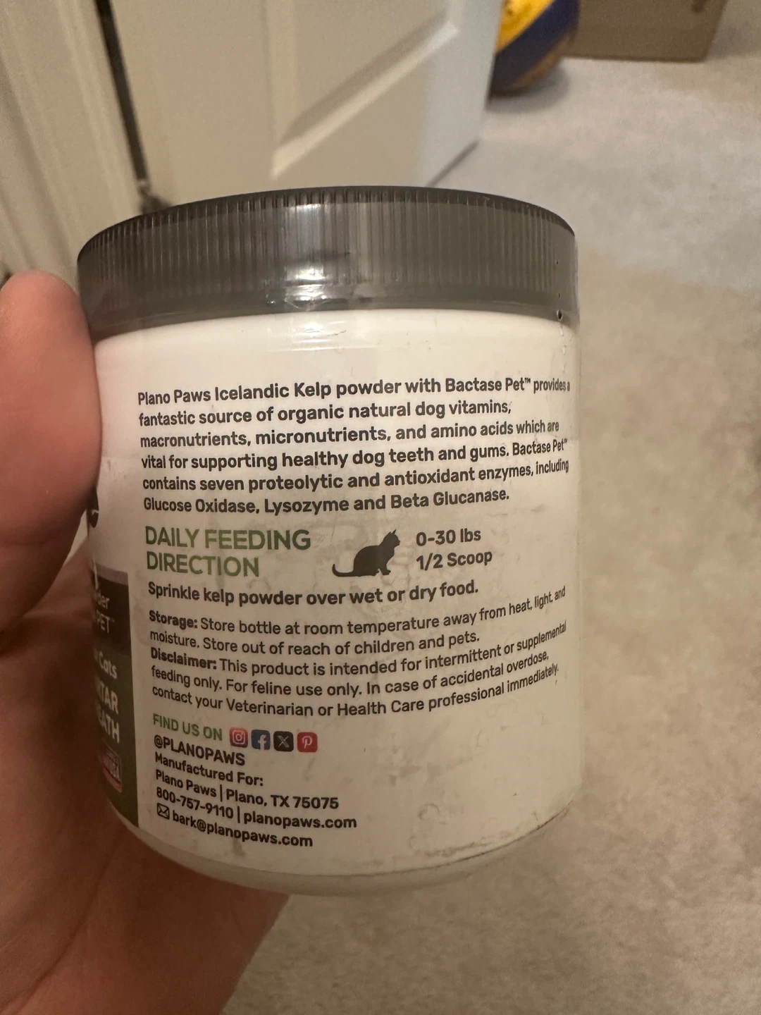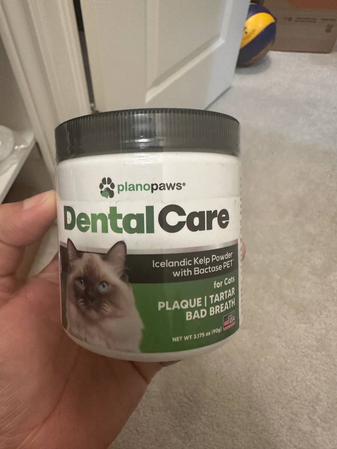 I'm selling a container of Plano Paws Dental Care for cats. This is an Icelandic Kelp Powder with Bactase PET, designed to help with plaque, tartar, and bad breath. The ingredients include Icelandic Kelp powder and Bactase PET. Guaranteed analysis per administration unit (scoop)(3g): Crude Protein 53% min, Crude Fat 2% min, Crude Fiber 4% max, Ash 29% max, Moisture 9% max. Calorie Content 3680 kcal ME/kg, 11 kcal/scoop (3g)