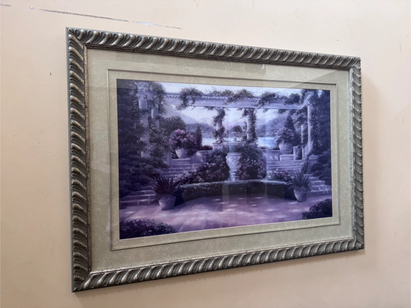 This is a framed print of a garden scene, perfect for adding a touch of elegance to your home. The frame is ornate and complements the artwork nicely. It's in great condition and ready to hang!