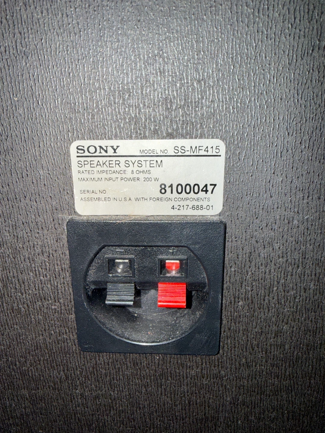 Selling a pair of Sony SS-MF415 speakers! These are rated impedance 8 Ohms with a maximum input power of 200W. They're in good condition and ready to fill your space with sound