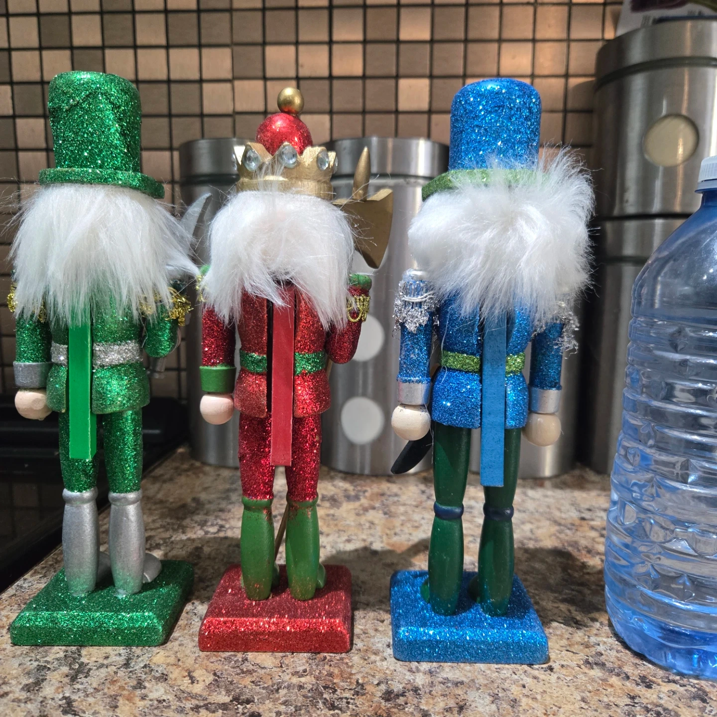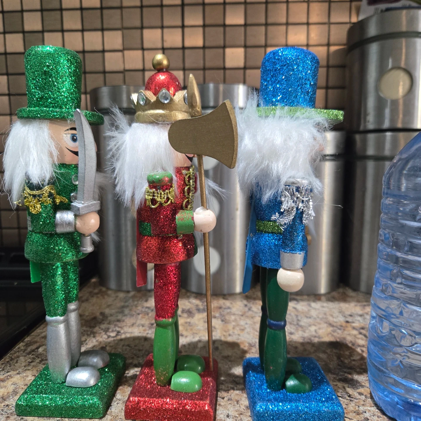 Here's a set of three decorative nutcracker figures! They are in green, red, and blue, and would look great as a festive touch to any room