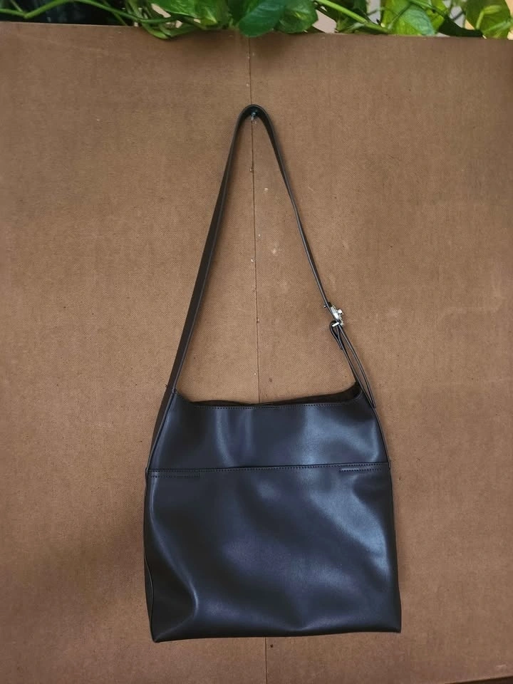 • Dark brown faux leather with large front pocket and inside pocket