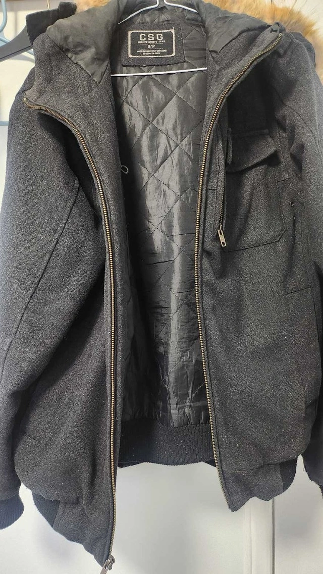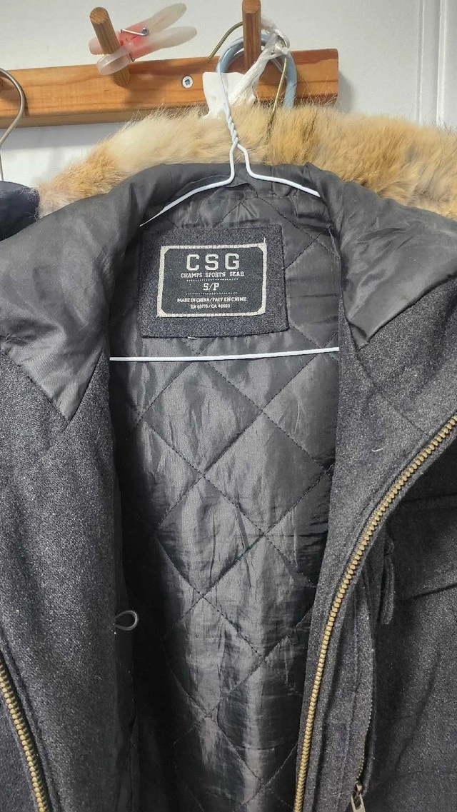 This CSG jacket is a stylish and warm choice for colder weather, featuring a wool blend exterior, a quilted interior lining, and a faux-fur trimmed hood for added protection against the elements; a versatile addition to any wardrobe for both casual and semi-formal occasions. This item is used, but in good condition. Here are some more details:
