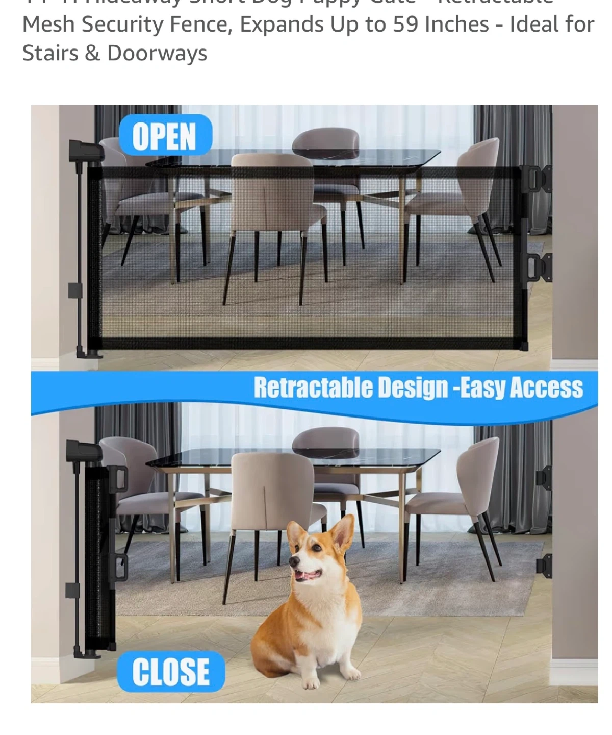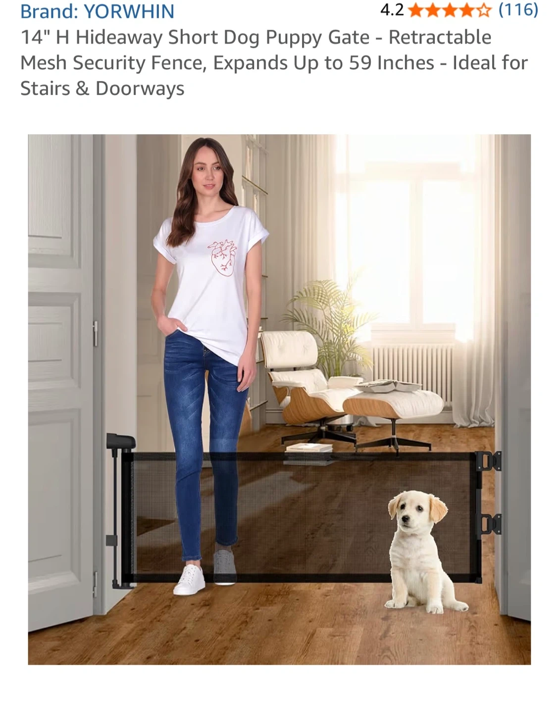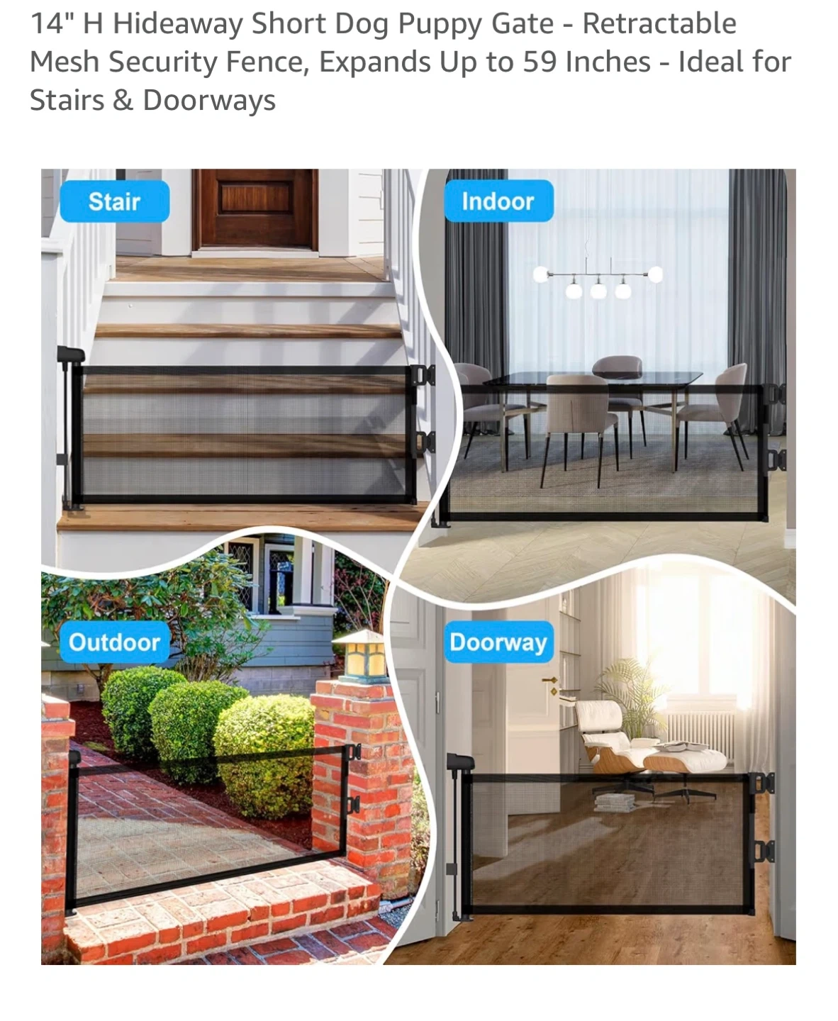 brand new YORWHIN 14" Hideaway Short Dog Puppy Gate! It's a retractable mesh security fence that expands up to 59 inches. Ideal for stairs