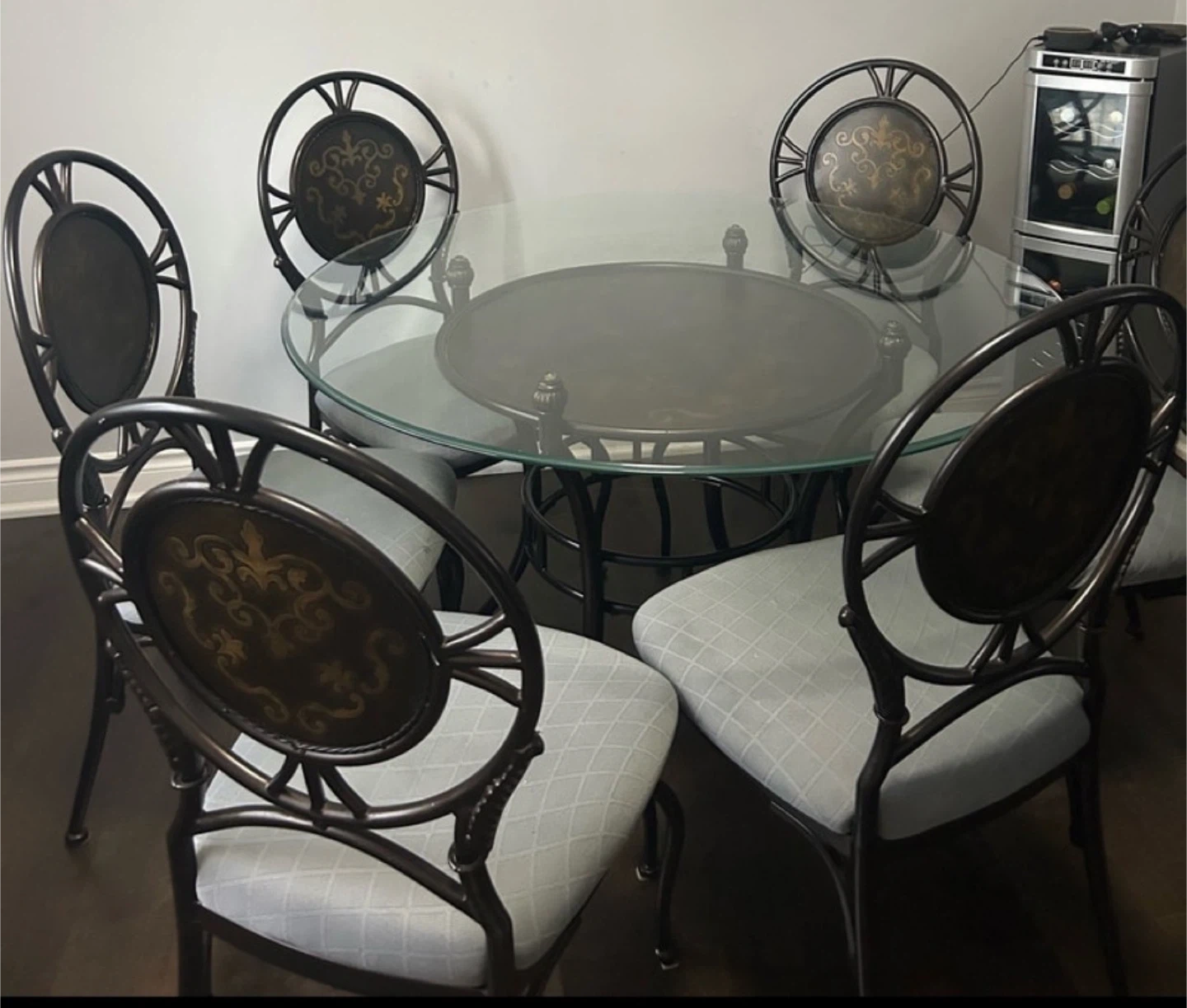 Selling a dining table set that includes a glass top table and six chairs. The chairs feature a unique oval back design with a decorative pattern and light blue patterned cushions. The table has a sleek glass top with a decorative metal base. It's a great set for any dining room