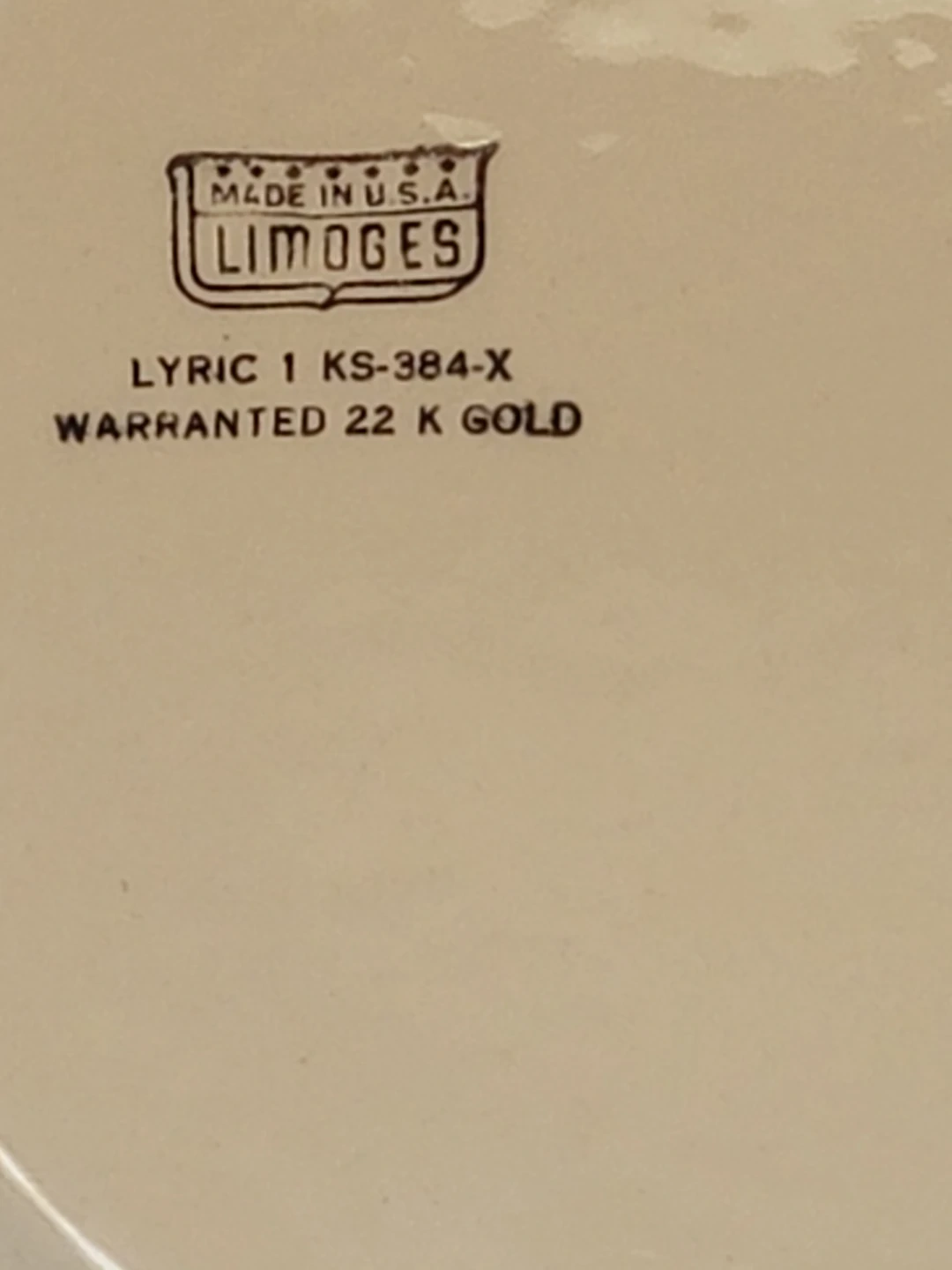 Selling a beautiful Limoges plate with a delicate floral design and warranted 22K gold accents. The model number is Lyric 1 KS-384-X. It's in great condition and would make a lovely addition to any collection