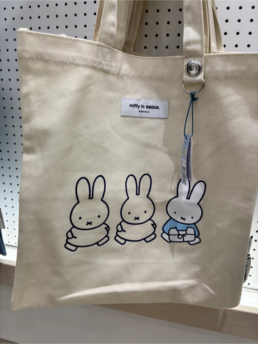 Selling a cute Miffy in Seoul tote bag! It features a charming design of three Miffy characters. This tote is perfect for carrying your everyday essentials with a touch of whimsy