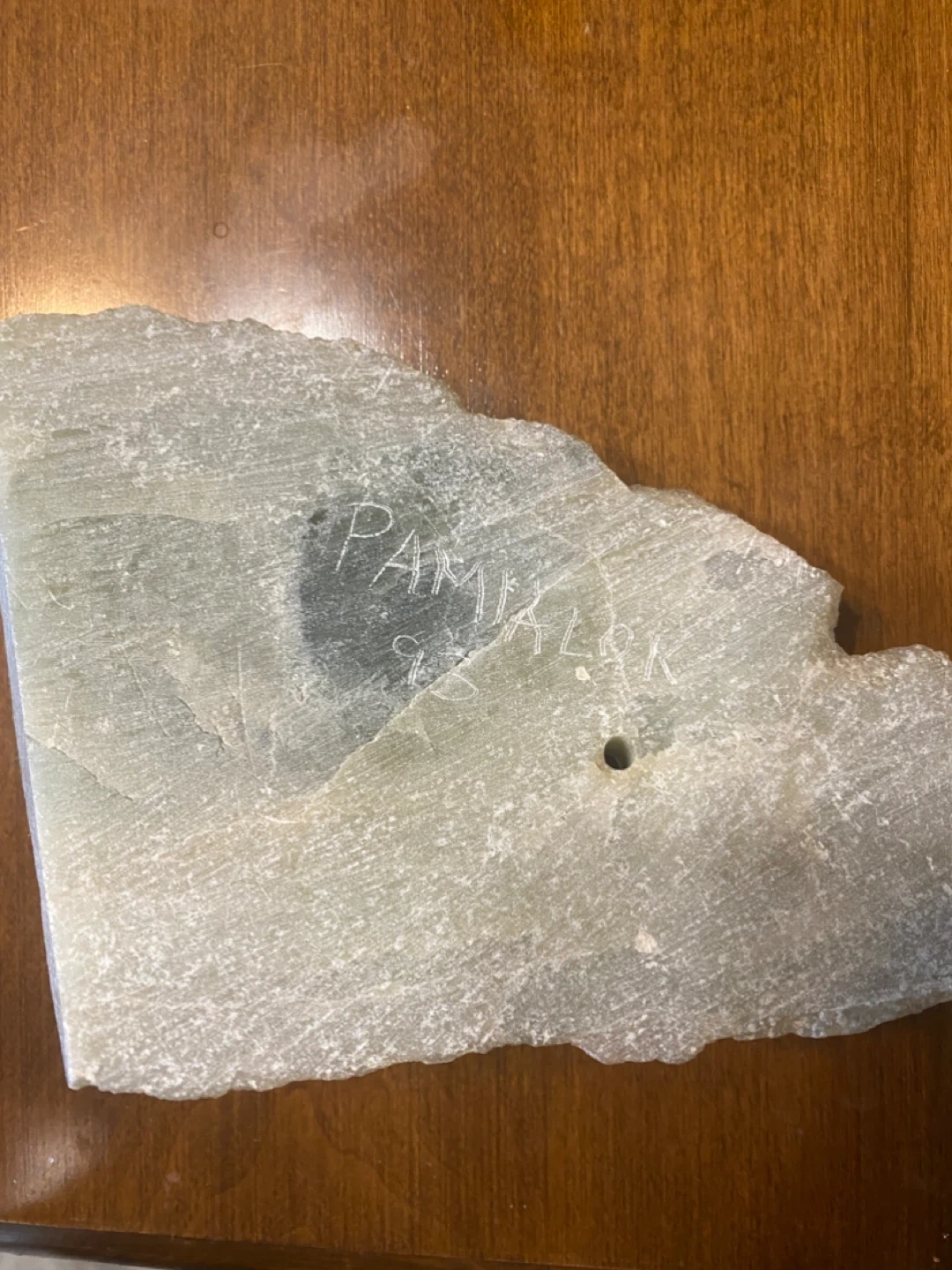 Here's a unique Inuit carved stone sculpture, featuring a figure in a standing pose. The sculpture is made of a greenish-grey stone with natural variations in colour and texture. The base is signed "PAMI ARLOK 95". It's a beautiful piece of Indigenous art!