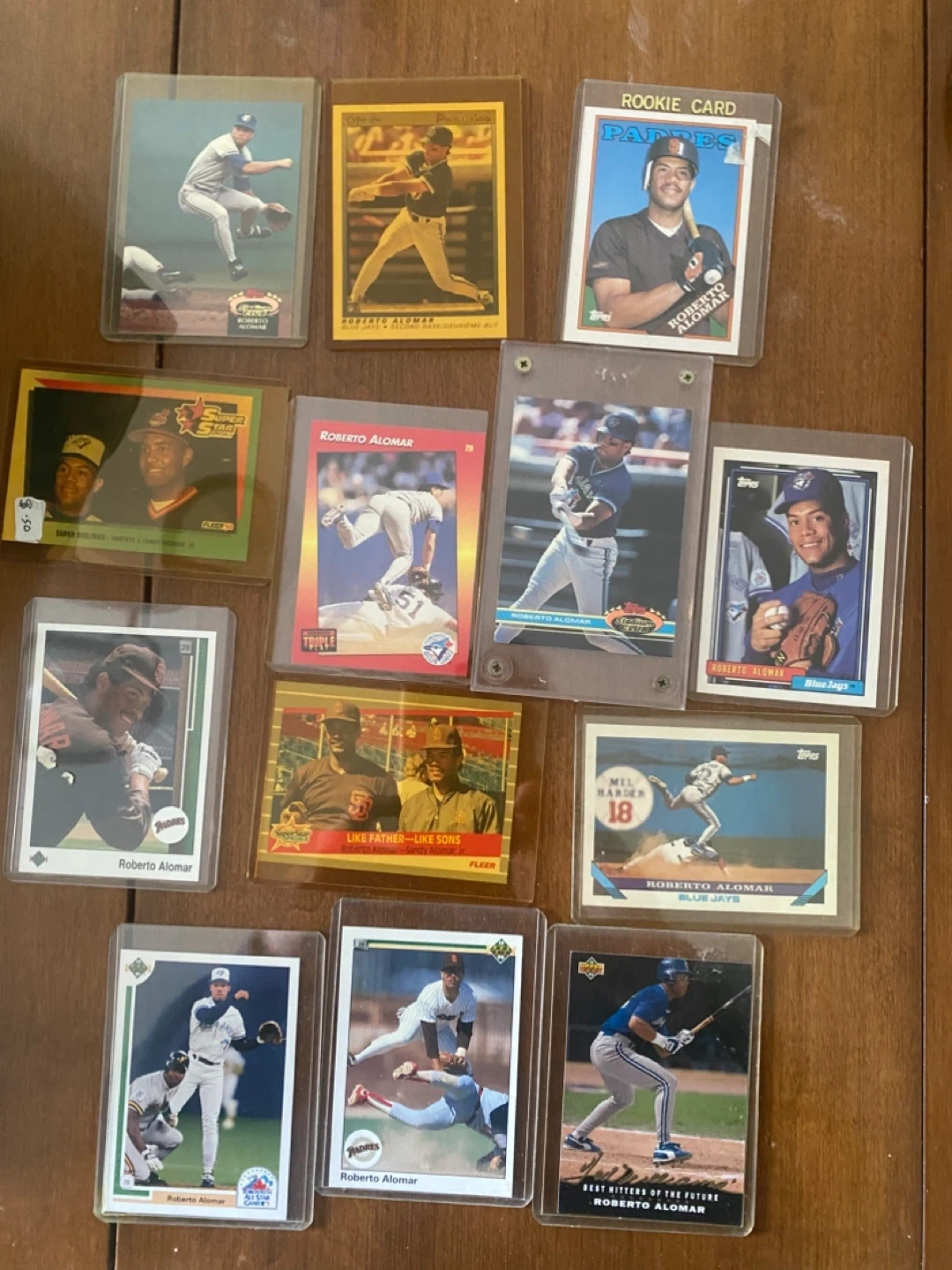 Selling a collection of Roberto Alomar baseball cards. These cards feature Alomar in various teams like the Padres and Blue Jays. A great addition for any baseball card collector! Over 70 cards in great condition including rookie card
