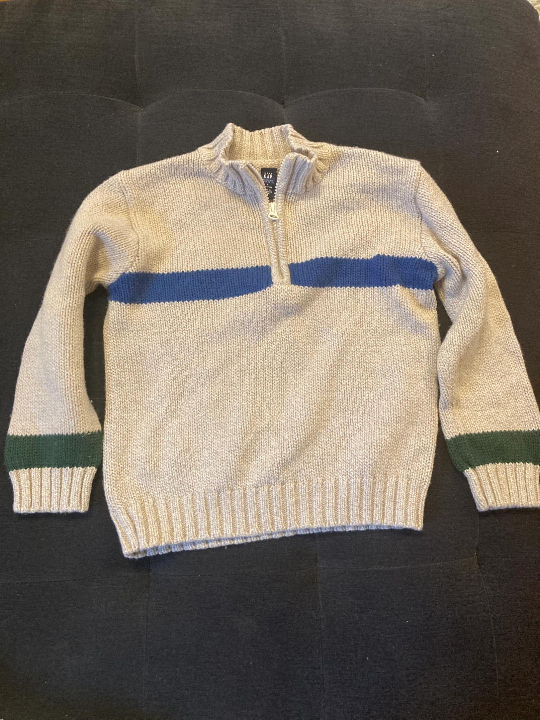 Here's a cozy GAP Kids sweater! It's a neutral colour with a blue stripe across the chest and green detailing on the cuffs. Perfect for layering on cooler days