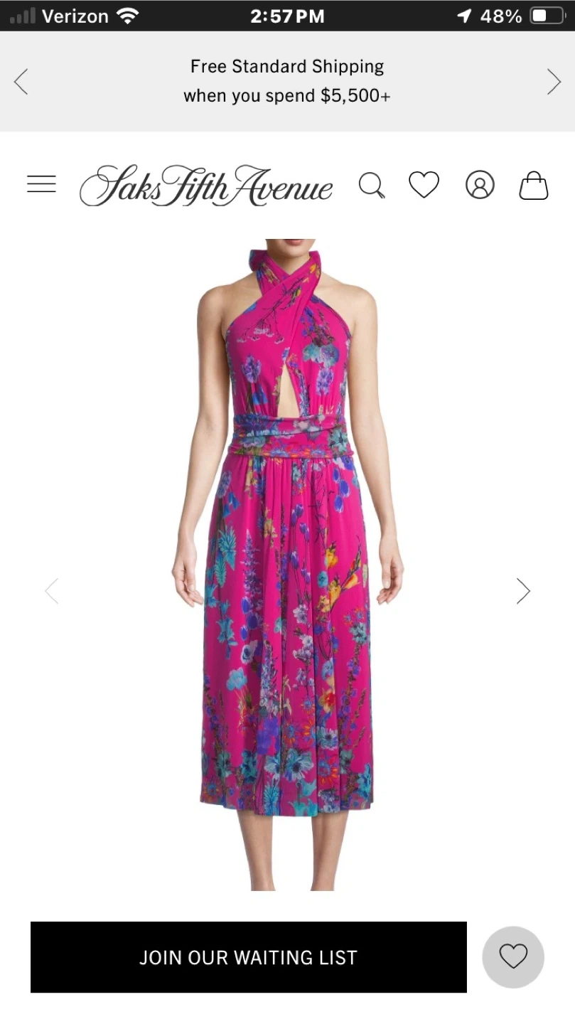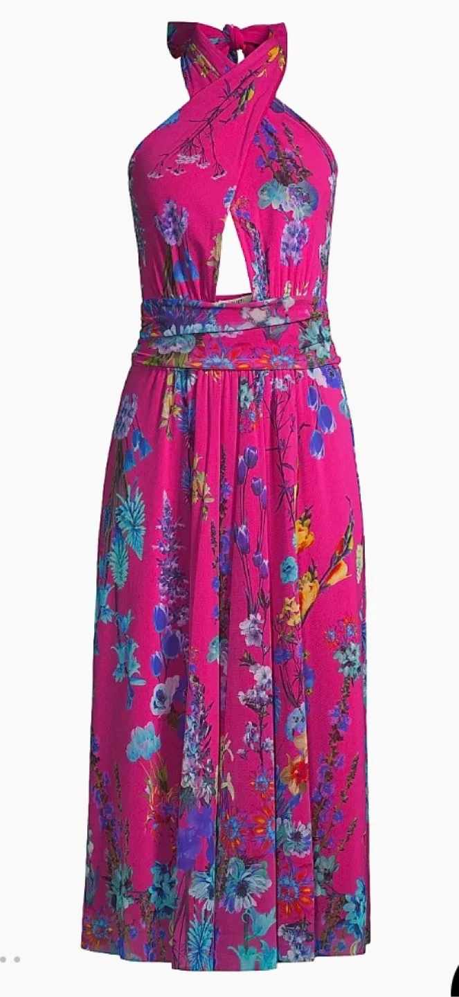 Beautiful Saks Fifth Avenue midi dress with a vibrant floral print. This eye-catching dress is perfect for any occasion. It features a unique halter neckline and a flattering silhouette. The colorful floral design makes it a standout piece!