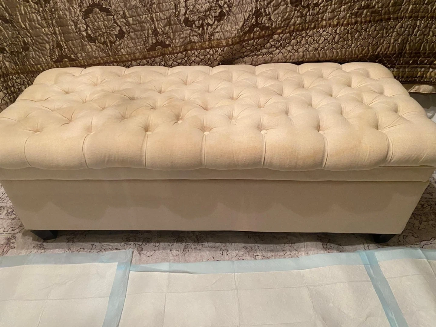 Looking to sell this tufted ottoman storage bench! It's a stylish and functional piece that can add a touch of elegance to any room. It offers ample storage space while serving as a comfortable place to rest your feet or as extra seating. Perfect for decluttering and adding a cozy vibe to your space!